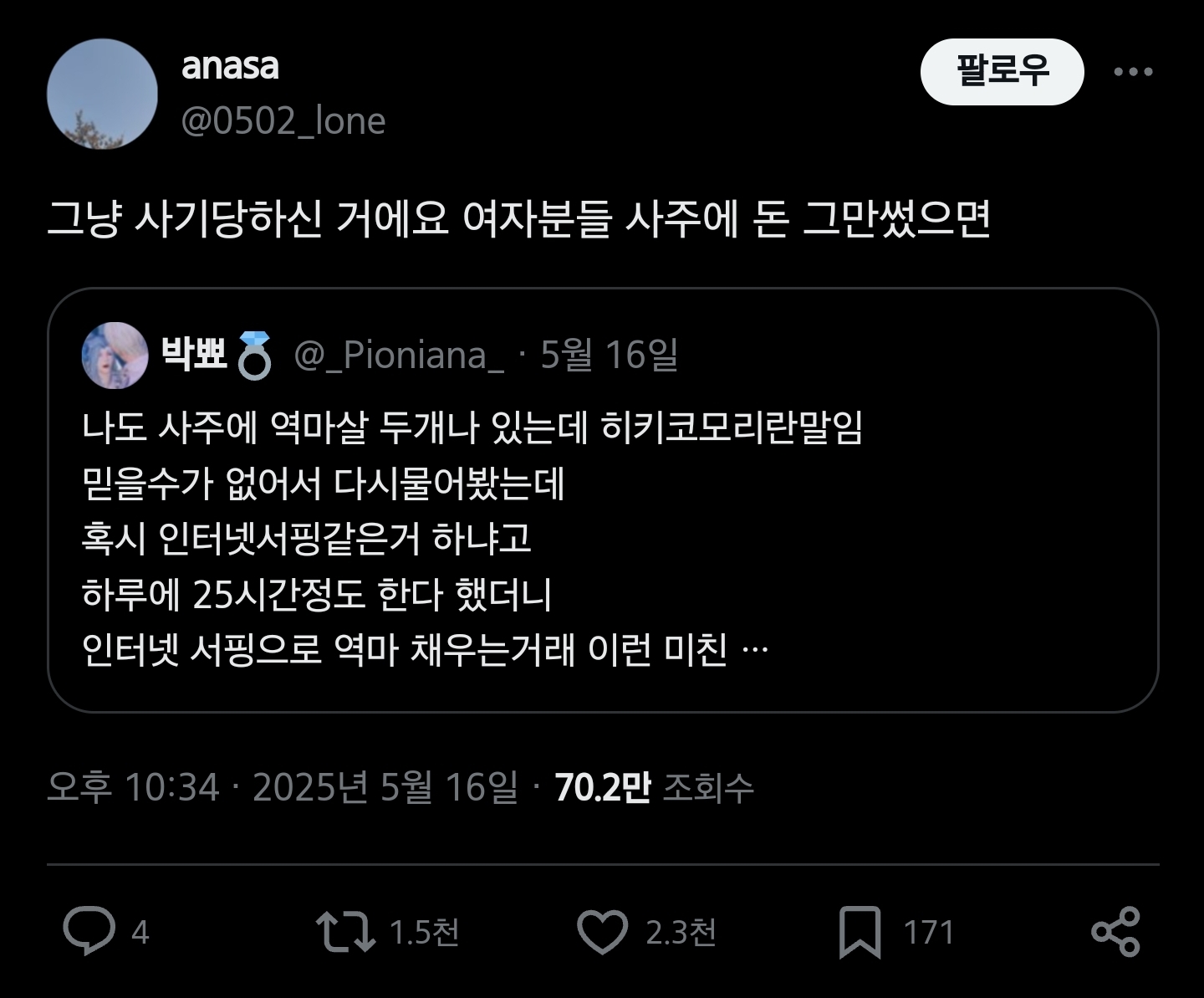 그냥 사기당하신 거에요 여자분들 사주에 돈 그만썼으면 https://t.co/TkO7fVjh6i