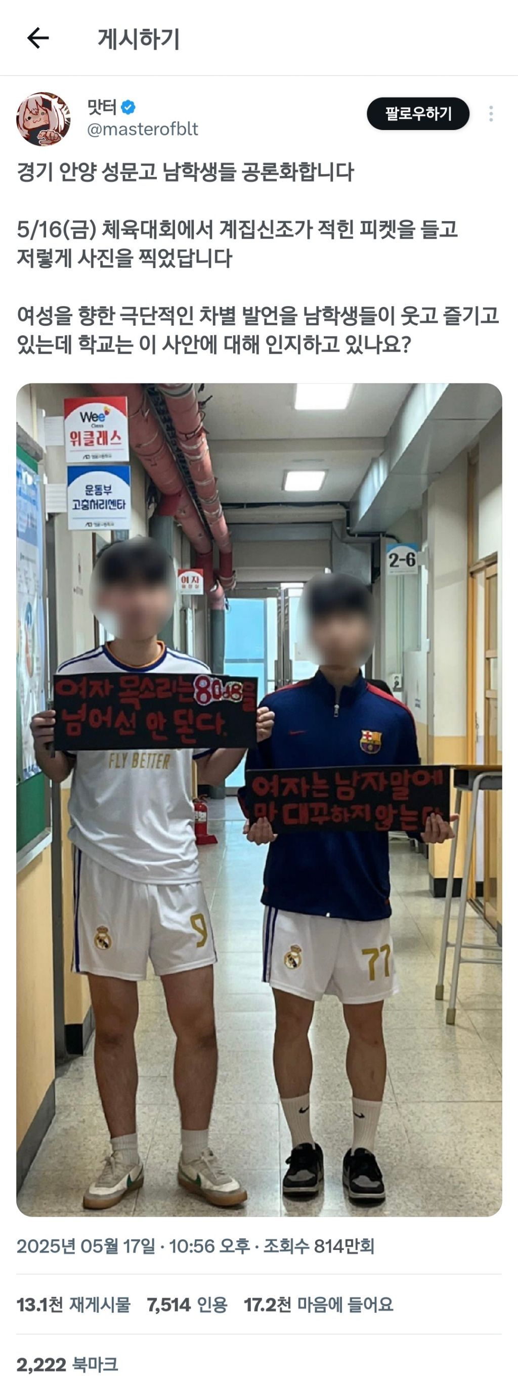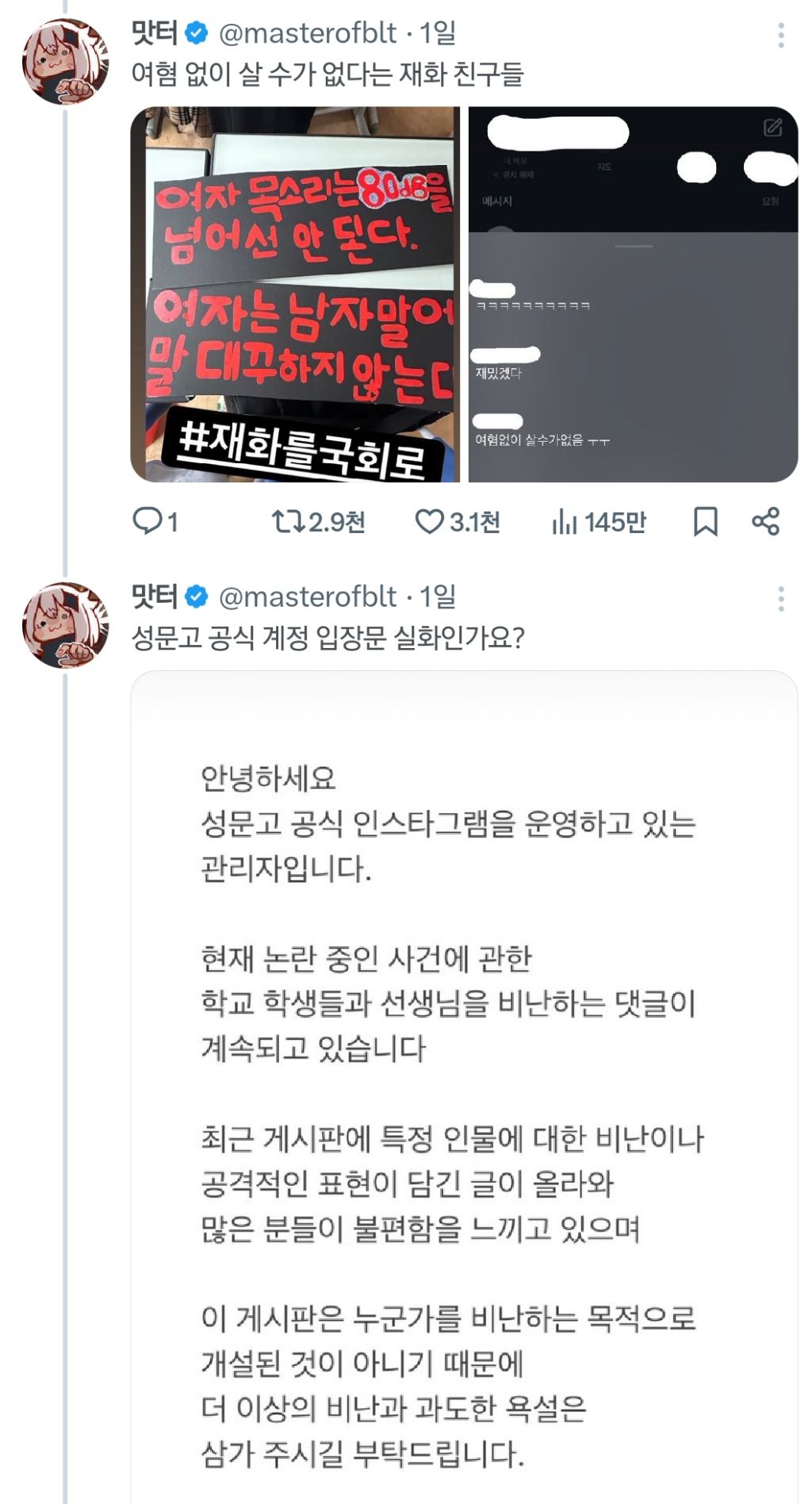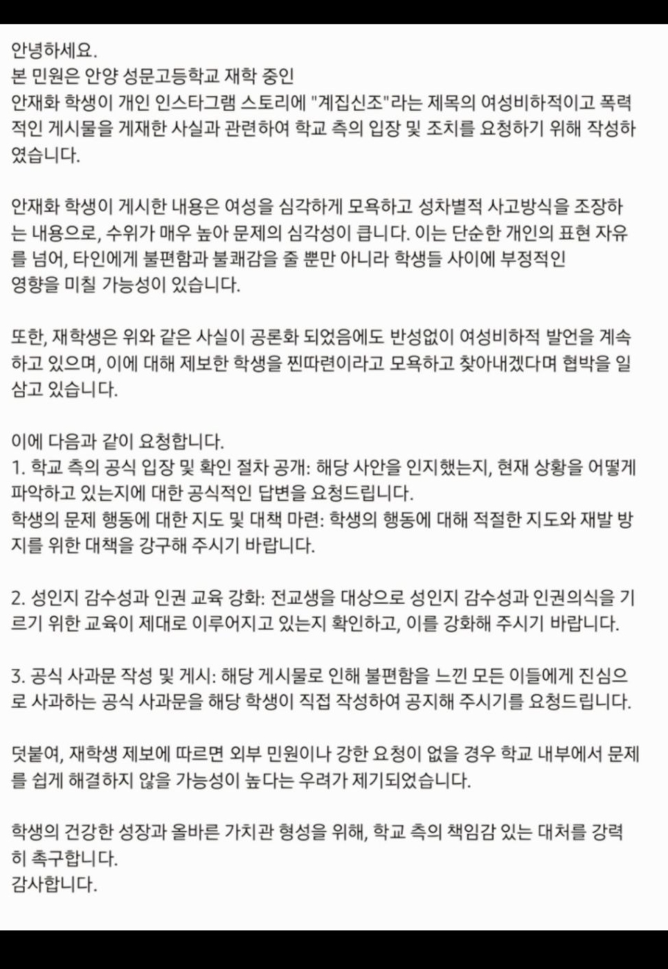 본 민원은 안양 성문고등학교 재학 중인 안재화 학생이 개인 인스타그램 스토리에 "계집신조"라는 제목의 여성비하적이고 폭력 적인 게시물을 게재한 사실과 관련하여 학교 측의 입장 및 조치를 요청하기 위해 작성하였습니다.