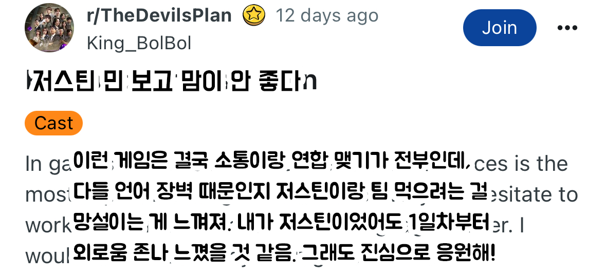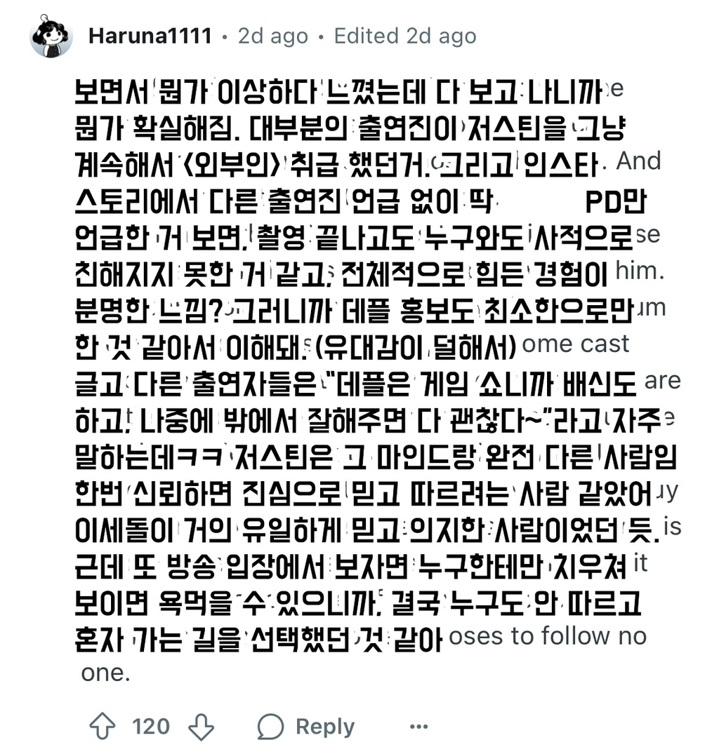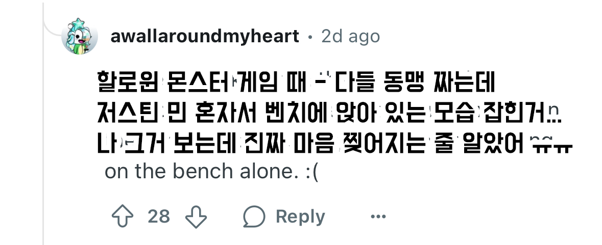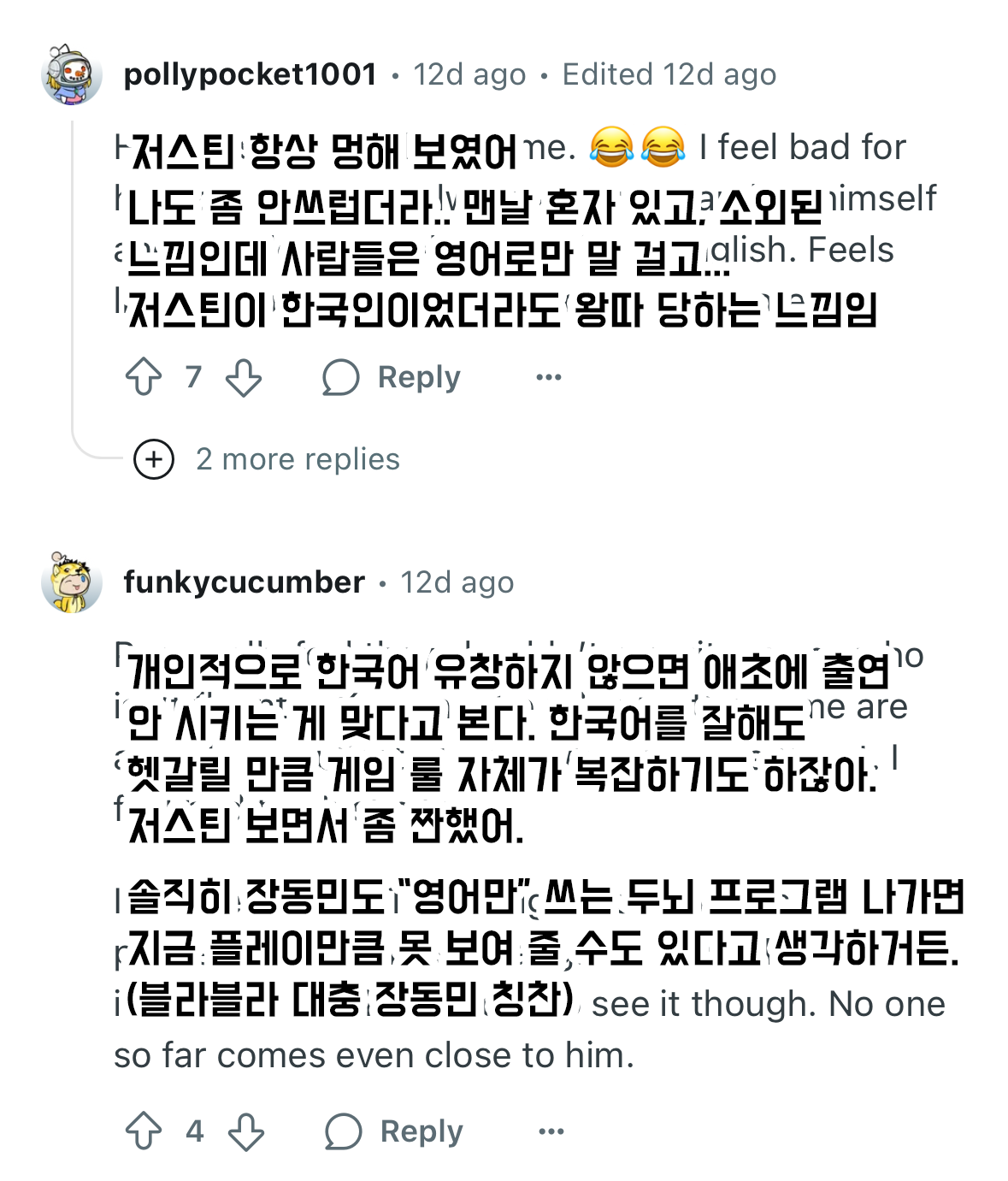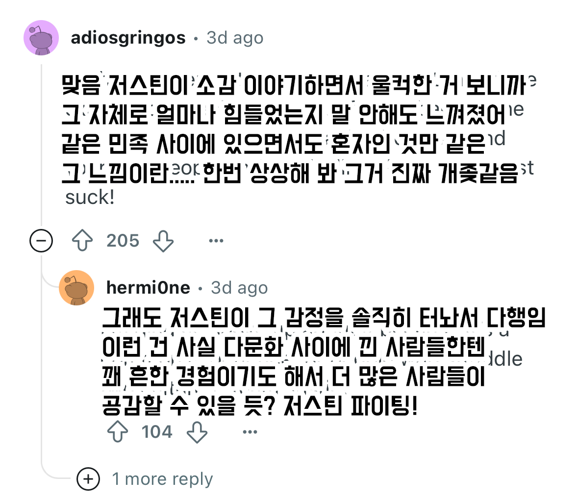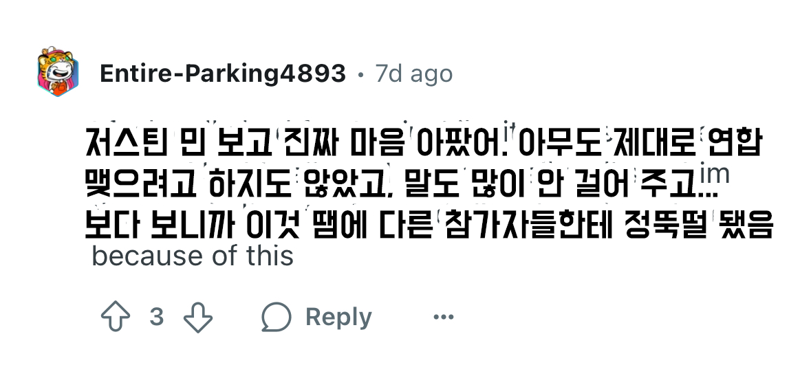 확실한 건 외국인들 눈에도 저스틴은 "혼자가 편한 사람"이 아니라 "배제된 외국인"으로 보인다는 거