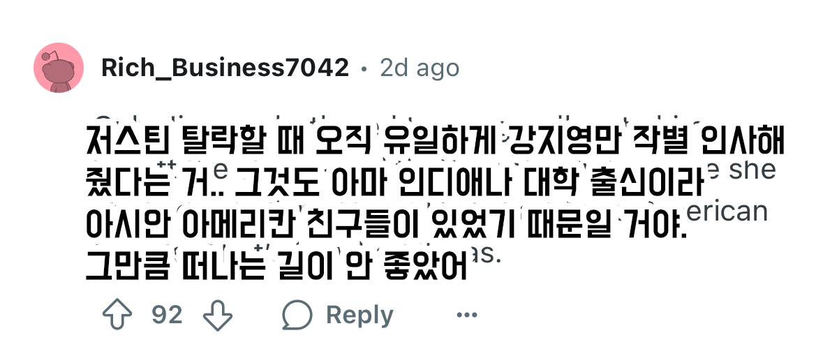 강지영이 그나마 인사해 주고 따뜻함을 보여 줘서 좋았다 등등