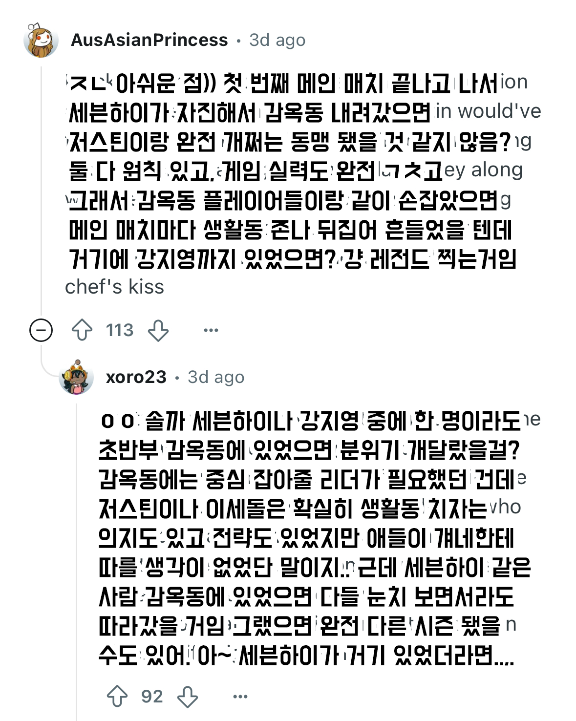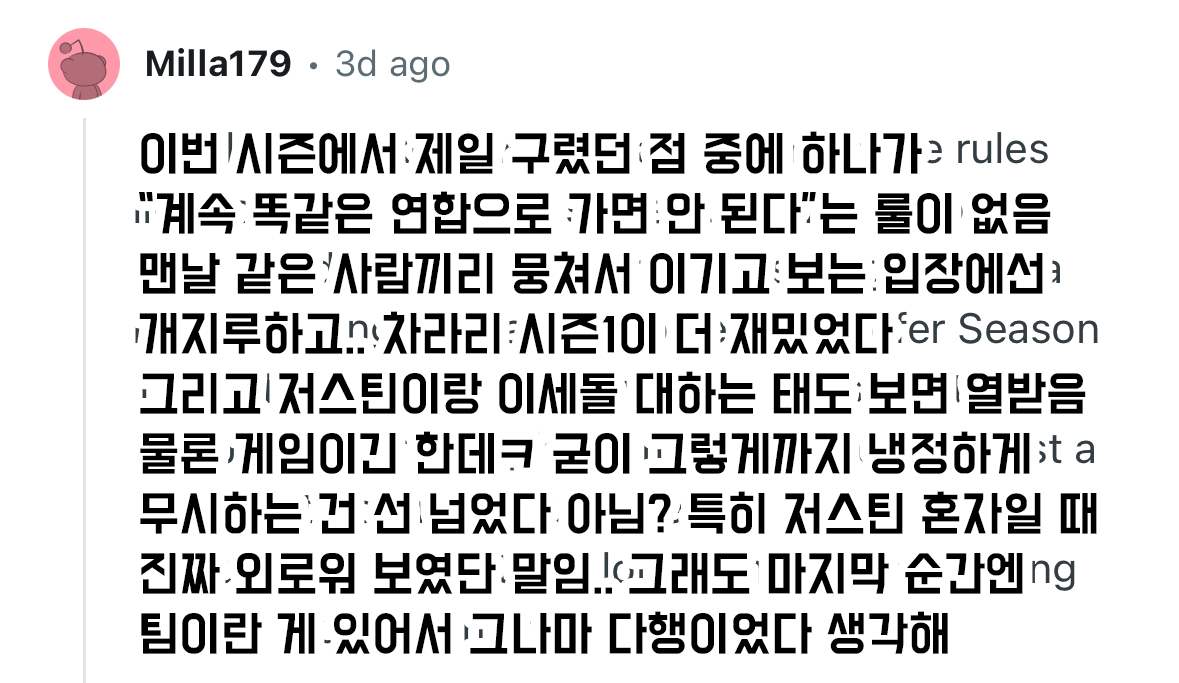 더군다나 은유가 저민 제안 거절 때 세돌 핑계 댔는데 정작 세돌은 셋이 연합한거나 저민이 5:1 연합 제안했던 내용 자체를 모르고 있었음 나중에 저스틴 말 듣고 나서 니네 셋은 그렇게 살고 그럼 나머지 우리 둘은? 이라고 세돌도 어이없어 한 것도 팩트임 -