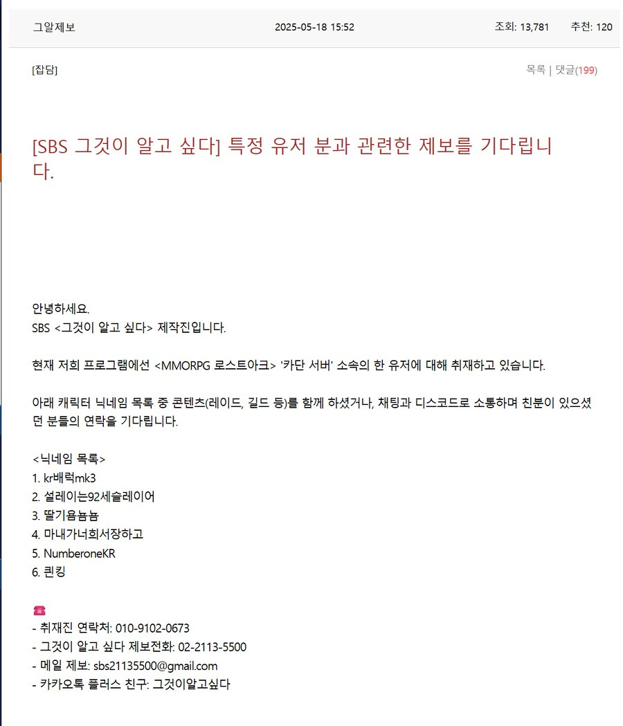 그알이 이번에 <<<찾는다고 올린 닉네임은