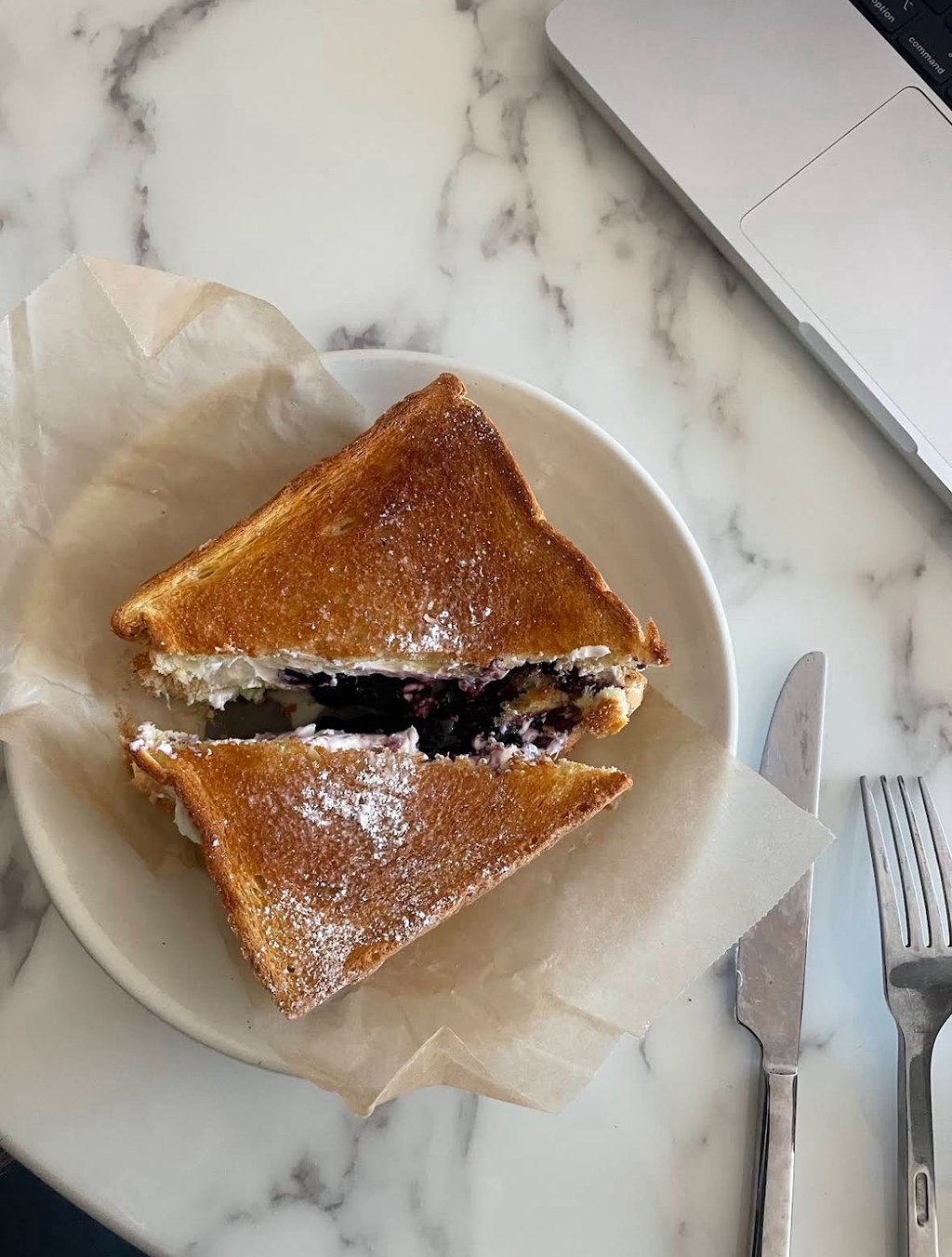 inspired by the trending story in Korea where a girl had to call her ex-boyfriend, whom she got over already to ask for the toast recipe he made tor her in the past. made with cream cheese & bluebery preserves.