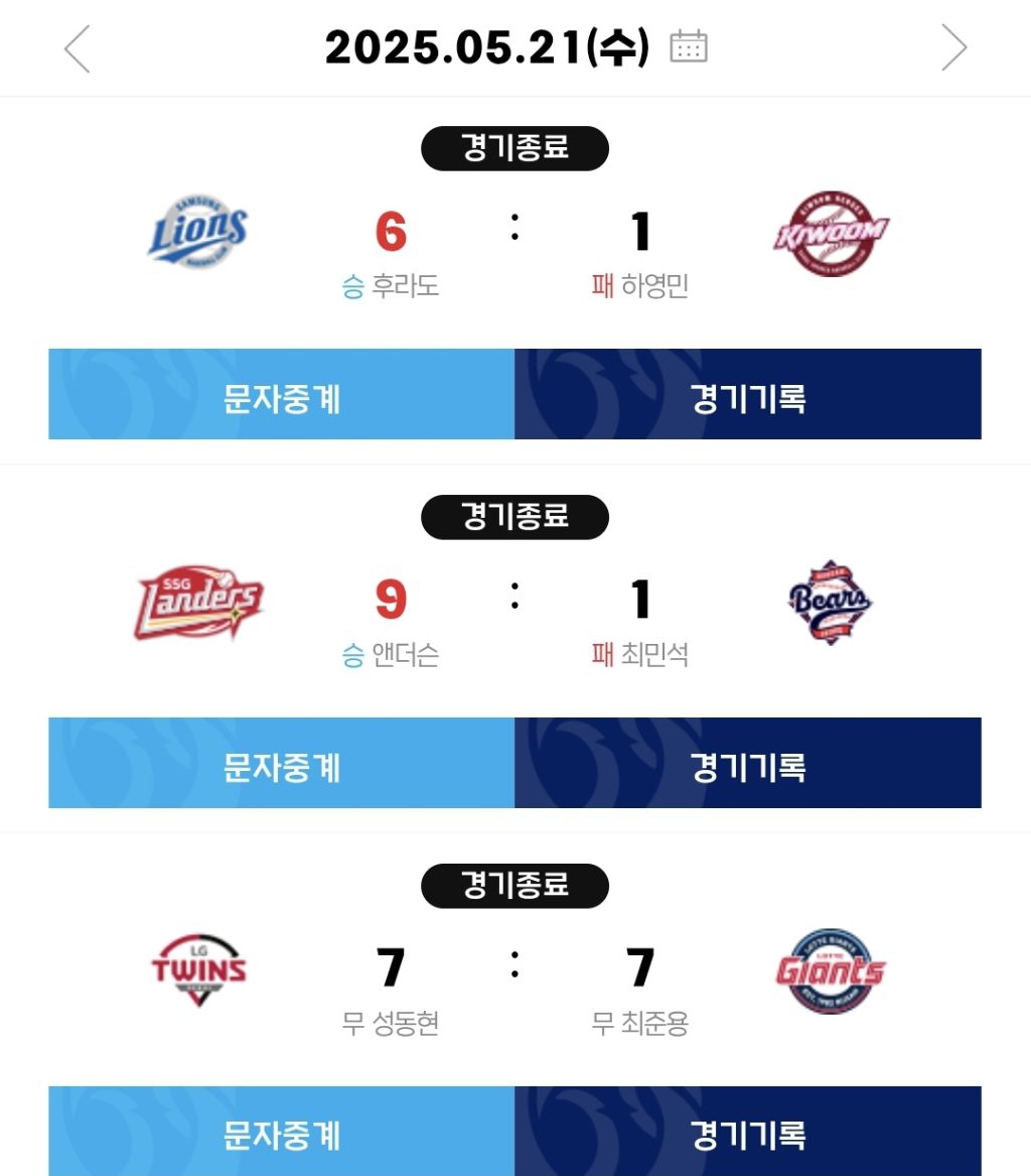 *여성시대* 차분한 20대들의 알흠다운 공간 [흥미돋][야구] 5월 21일 경기 결과와 팀 순위 작성시간25.05.21|조회수17,965 목록 댓글 205 글자크기 작게가 글자크기 크게가 출처: 여성시대 아이스맥심라떼*내일 선발투수* 다음검색 현재 게시글 추가 기능 열기 북마크 공유하기 신고 센터로 신고 댓글 205 댓글 리스트 작성시간 25.05.22 작성시간 25.05.22 작성시간 25.05.22 롯데야 ,, 작성시간 25.05.22 작성시간 25.05.22 카페 방문해 더 많은 댓글 만나기!