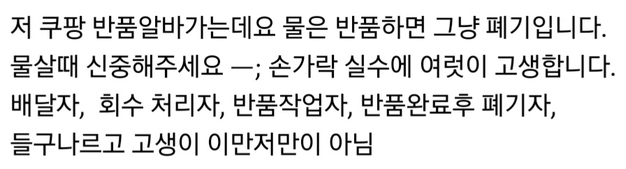 ㄹㅇ 반품거부도 있거나 적정선이 있어야한다고 생각함 1톤을 반품하면 배달,회수하는 기사님들은 어쩌냐고