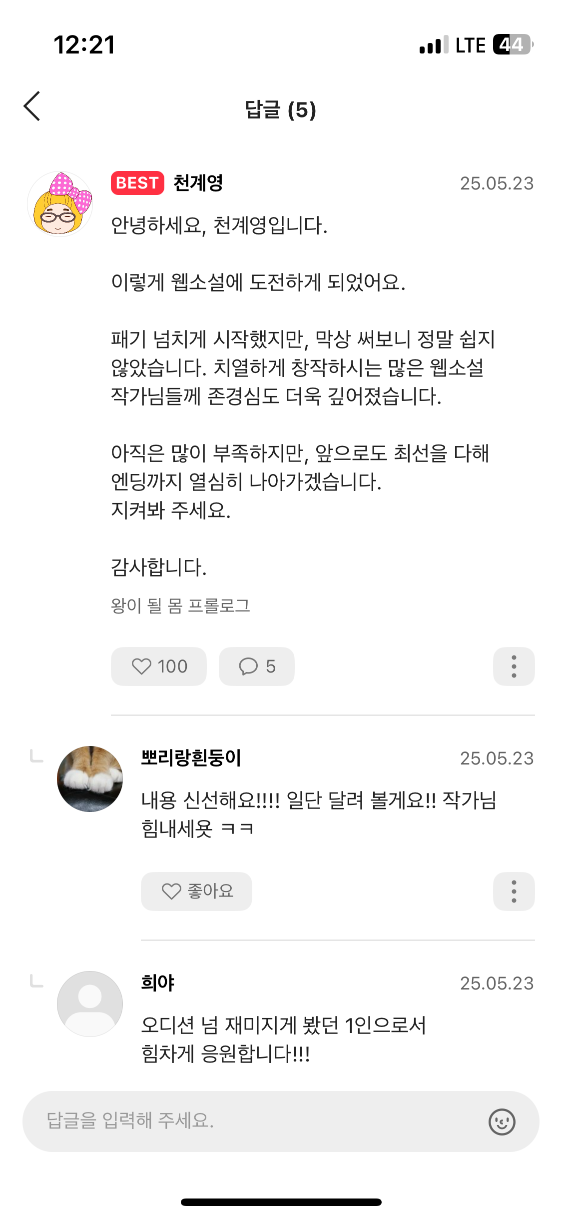 [흥미돋]<오디션> 만화가 천계영 웹소설 작가 데뷔 작성자베러댄골|작성시간25.05.24|조회수48,045 목록 댓글 55 글자크기 작게가 글자크기 크게가 출처: 카카오페이지/여성시대 베러댄골여느날처럼 카카페 선물함 작품들 하나하나 열었다가 발견도전 응원합니다ㄷㄷ 다음검색 현재 게시글 추가 기능 열기 북마크 공유하기 신고 센터로 신고 댓글 댓글 55 댓글쓰기 답글쓰기 댓글 리스트 작성자석박지박사님 | 작성시간 25.05.24 와 진짜 대단하다 작성자뱅기니 | 작성시간 25.05.24 소름이야 바야지 작성자ㅈㅈㅈ진수맛궁금해허니 | 작성시간 25.05.24 천계영!!!!!!!!!!!! 오 ㅏ악!!!! 알려줘서 고마워!!! 작성자유잼유잼유잼 | 작성시간 25.05.24 줄거리 재밌다 역시 천계영ㅠㅠ 작성자별의별곡 | 작성시간 25.05.24 카카페 노열심히 젓더니 갑자기 모타뽀트를 달아버리네ㄷㄷ 댓글 전체보기