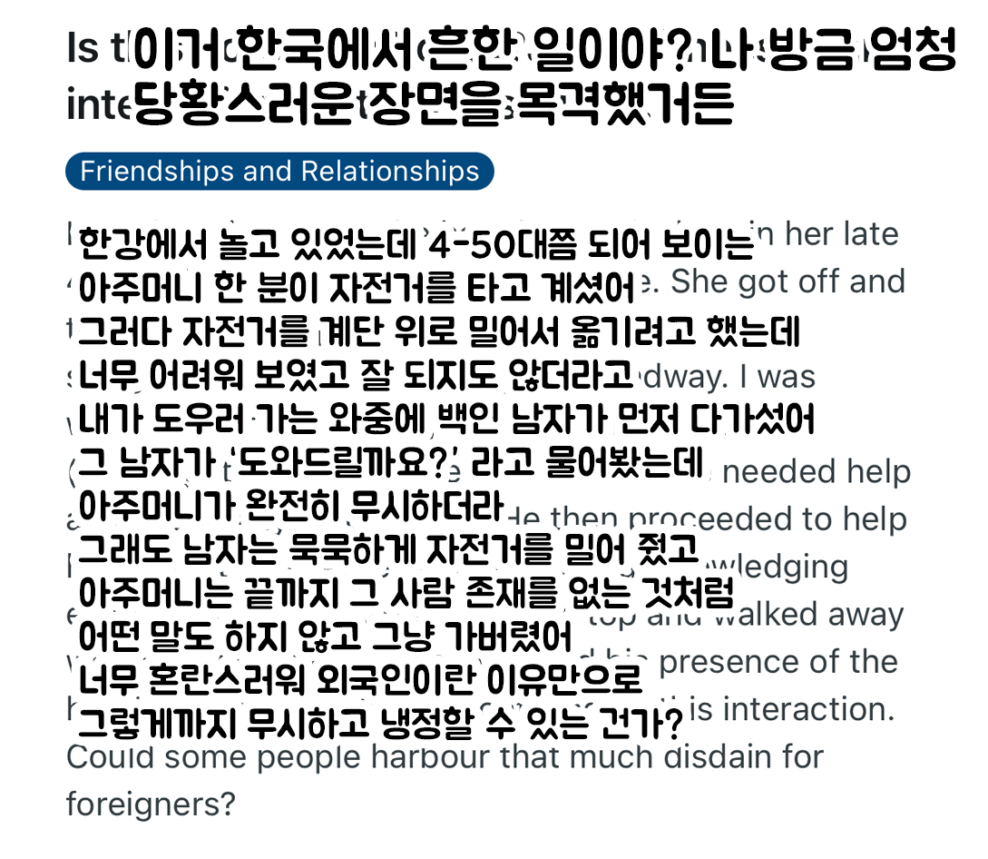 • 내 경험상, 그 백인 남자가 '외국인'이라서 그런 건 아닐걸. 대부분 한국인들은 자기 일에만 집중하고, 도움 주거나 받는 걸 별로 원하지 않아. 타인이 주목하는 건 '창피한'일이라고 여겨져. 아마 그 아줌마도 영어를 잘하지 못해서 창피함으로부터 벗어나려고 그냥 떠났을 거야..