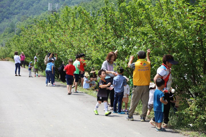 체험은 붉게 익은 앵두를 직접 수확하는 ‘앵두따기 체험’(유료), 트랙터 마차를 타고 마을을 둘러보는 ‘트랙터 마차타기’(무료), 버들치 낚시 체험(유료) 등 시골 자연 속에서 가족 단위로 가볍게 즐길 수 있는 체험들로 구성됐다.
