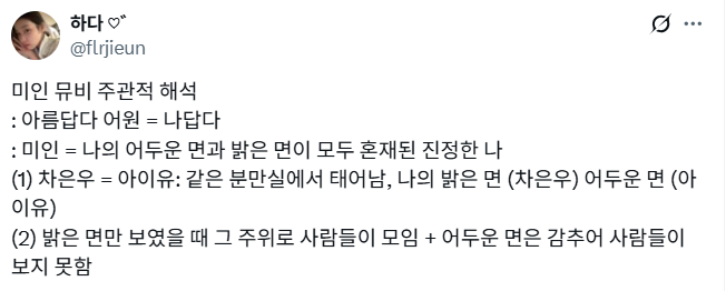 아이유 ”미인(美人=Me in)”이 나의 모든 명과 암을 사랑하는 노래라서 곱씹을수록 얼떨떨하게 좋음…. pic.twitter.com/iqU0GpSTqJ