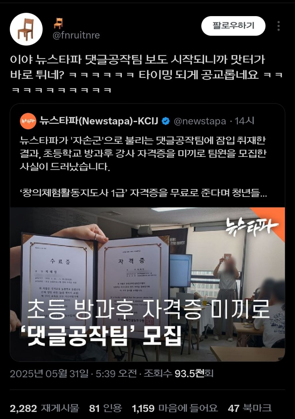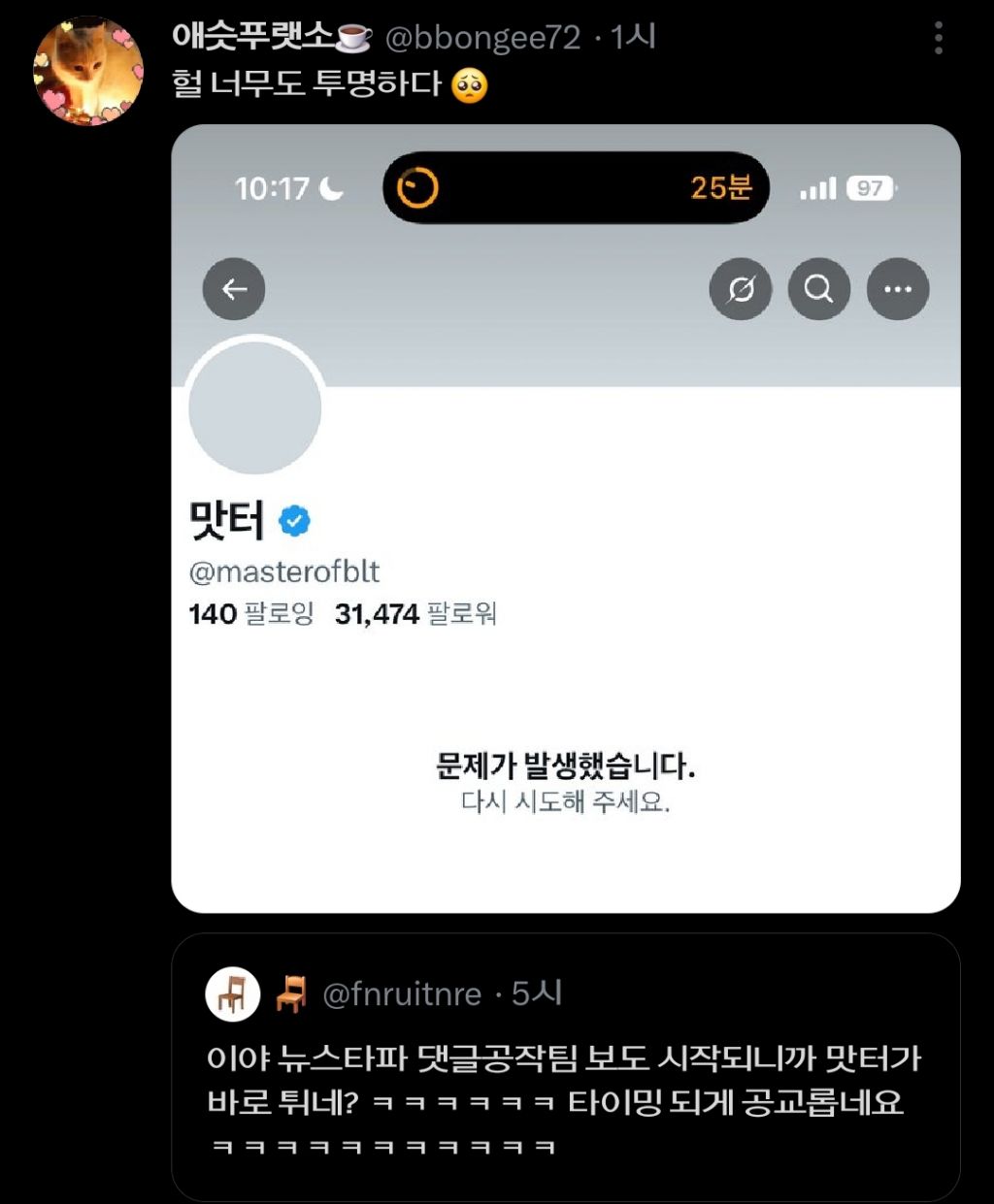 [기타]뉴스타파 댓글공작팀 보도가 시작되자 계정 터트린 맛터 작성자주엉주이|작성시간25.05.31|조회수21,225 목록 댓글 151 글자크기 작게가 글자크기 크게가 출처: 여성시대 주엉주이https://x.com/bbongee72/status/1928622026610061537?s=19 다음검색 현재 게시글 추가 기능 열기 북마크 공유하기 신고 센터로 신고 댓글 댓글 151 댓글쓰기 답글쓰기 댓글 리스트 작성자스님불교재밌나요 | 작성시간 25.05.31 ㅋㅋㅋㅋ와우 작성자밍구르밍밍묭 | 작성시간 25.05.31 맛터 그쪽세력같다고 의혹나오더니... 작성자잼시가대통령 | 작성시간 25.05.31 헐 이사람 나 추천에 계속 떠서 차단했는데 ㅋㅋㅋ 진짜 구리다 작성자틈새라면 빨계떡 | 작성시간 25.05.31 지금 여시들어와서 당혹스러운데 맛터가 뭔지 알수있나요..?ㅜ 트위터도 안해서 ㅠ 작성자설난영 | 작성시간 25.06.28 ㅉㅉ 댓글 전체보기