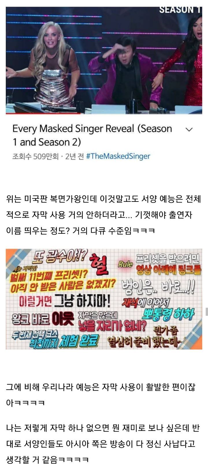 개인적으로 나는 무한도전 같은 예능은 자막이 다 살린다고 생각해서 우리나라 예능이 더 재밌음ㅋㅋㅋ