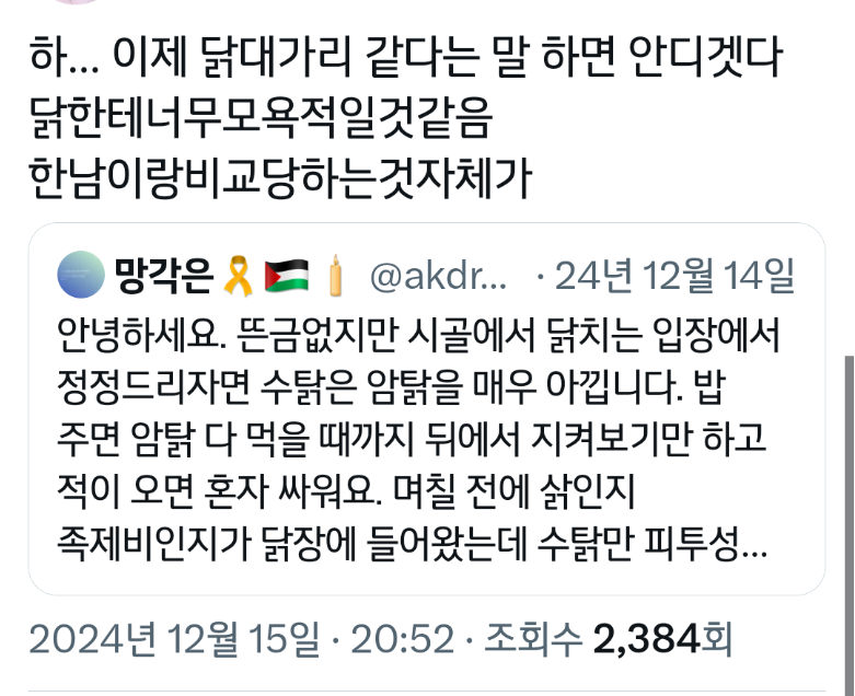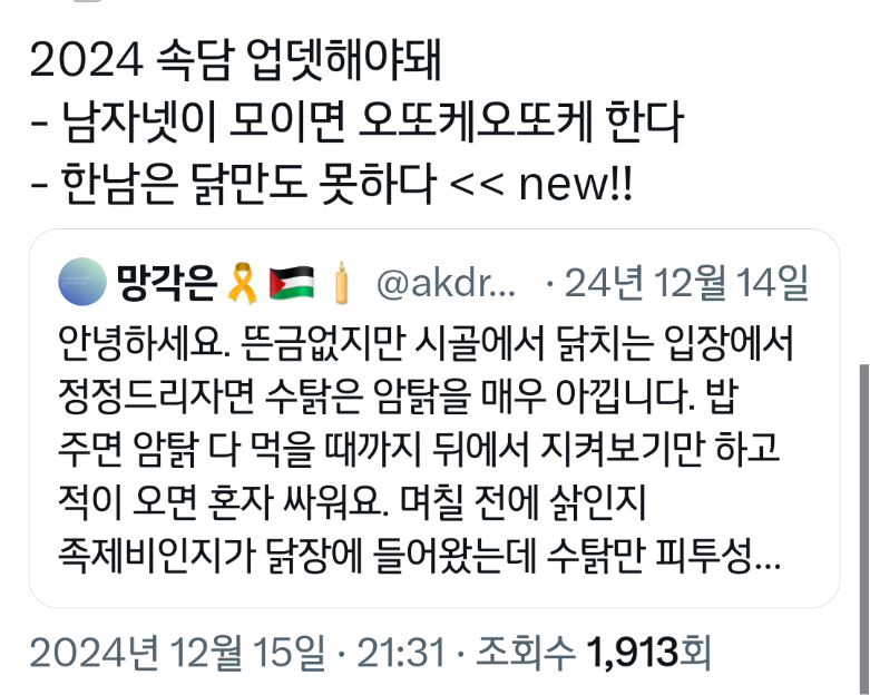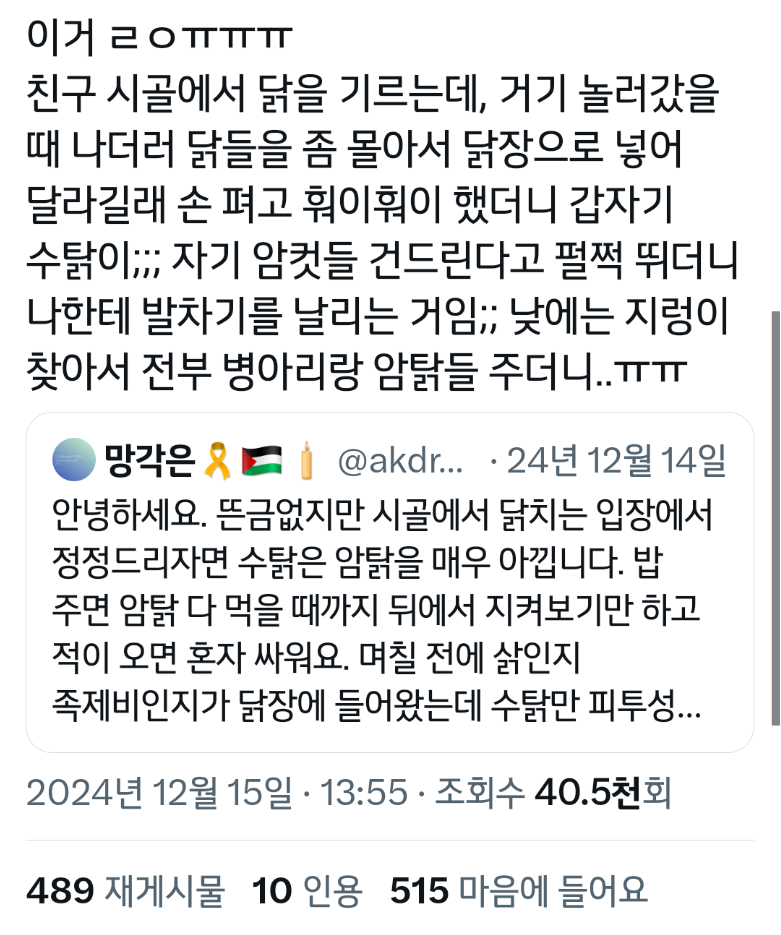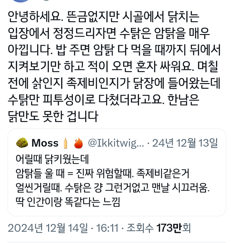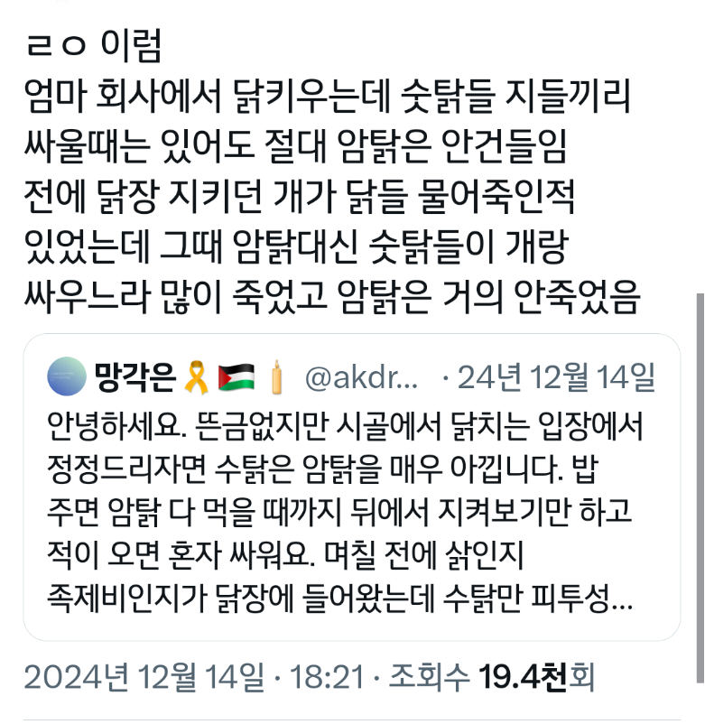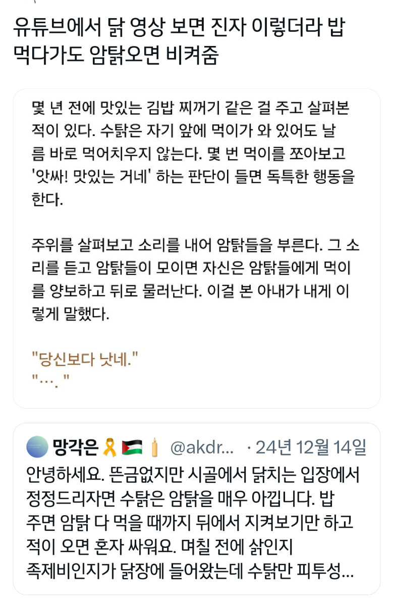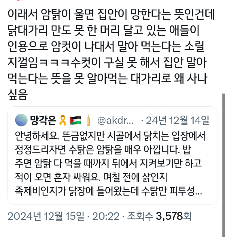 작성자가좍가보자고 작성시간 25.06.05 아 그래서 암탉이 울면 집안이 망한다는거구나 진짜 속담 미쳤네...