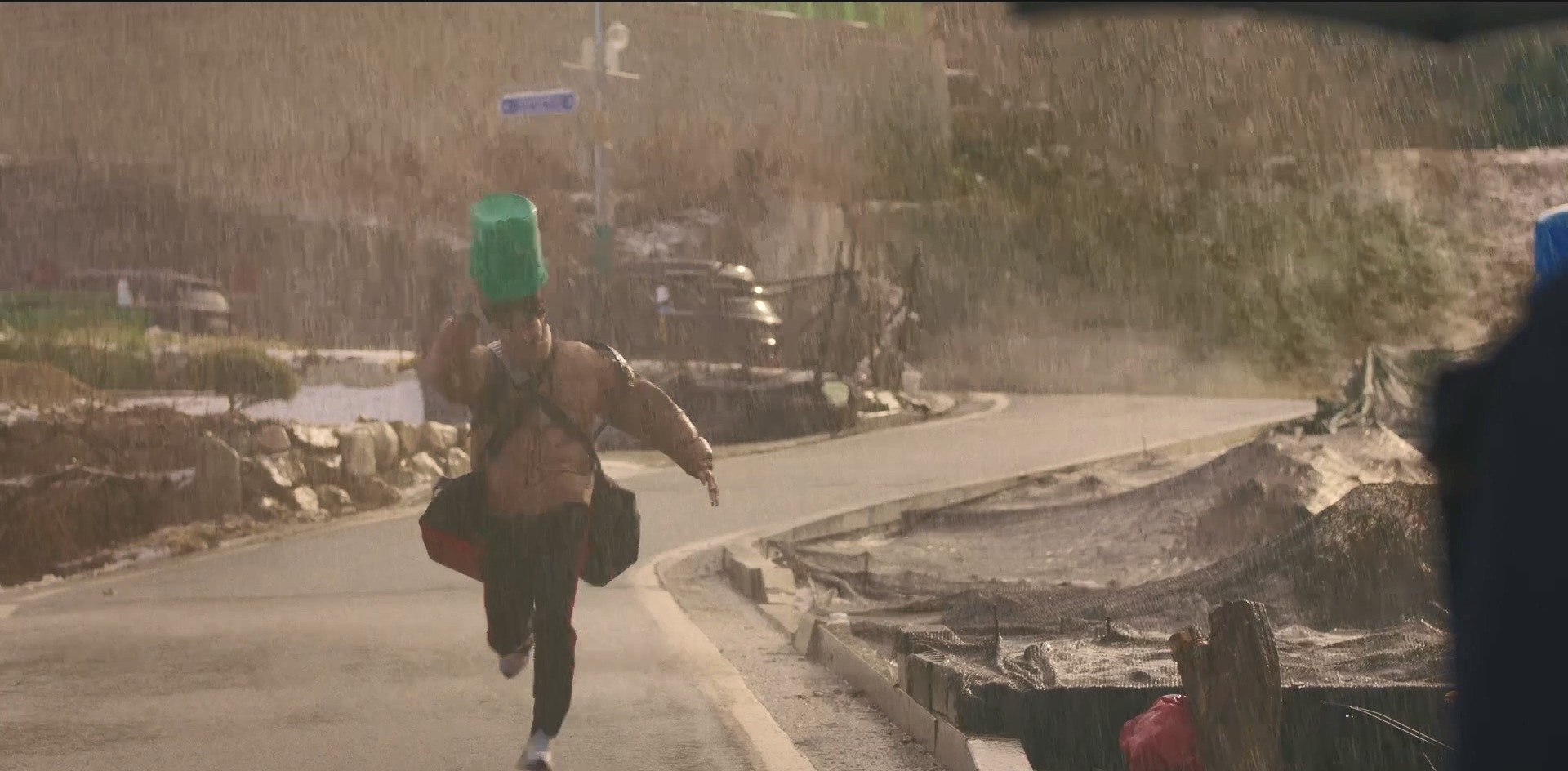 깨진 양동이 들고 흠뻑 젖어 나타난 놈