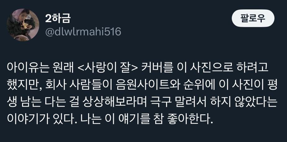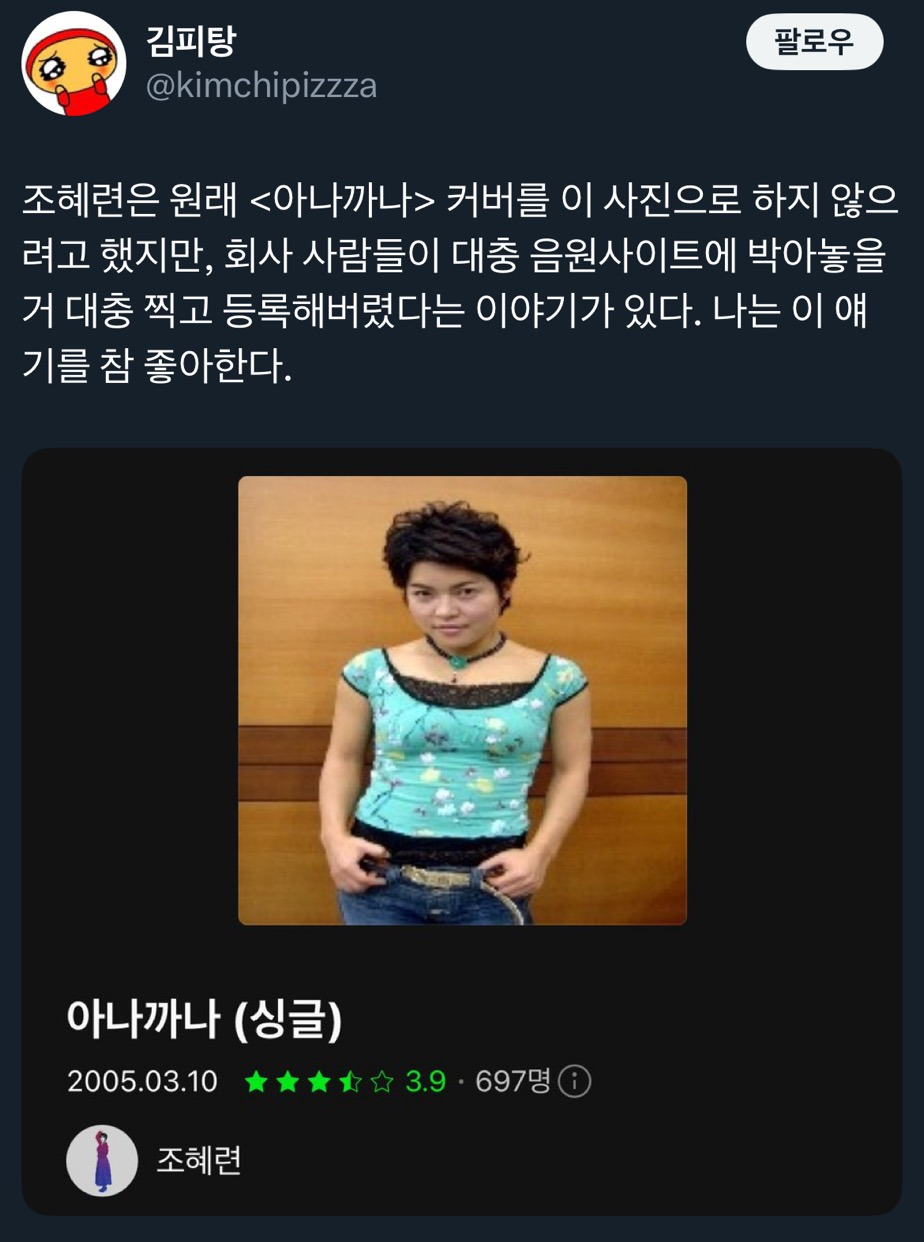 작성시간 25.06.07 ㅋㅋㅋ 힙하다 뮤비랑 잘 어울려.. 연애 잘 풀릴때 사진 같아서 노래가 더 슬펏을듯