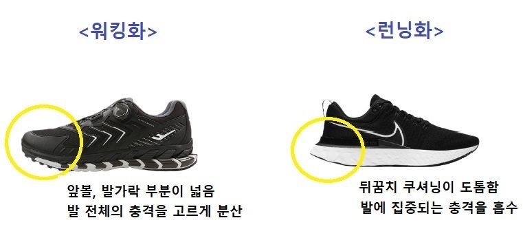 이렇듯 걸을 때와 뛸 때 우리 몸이 움직이는 원리가 다르기 때문에 각 운동에 따라 몸의 움직임에 최적화된 신발을 신어야 하는 것이다. 이에 따른 워킹화와 런닝화의 차이는 다음과 같다.