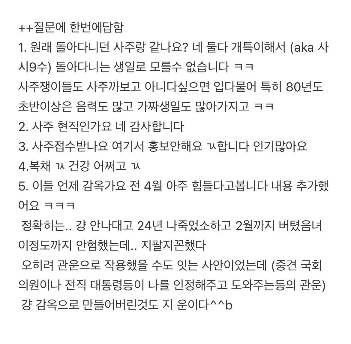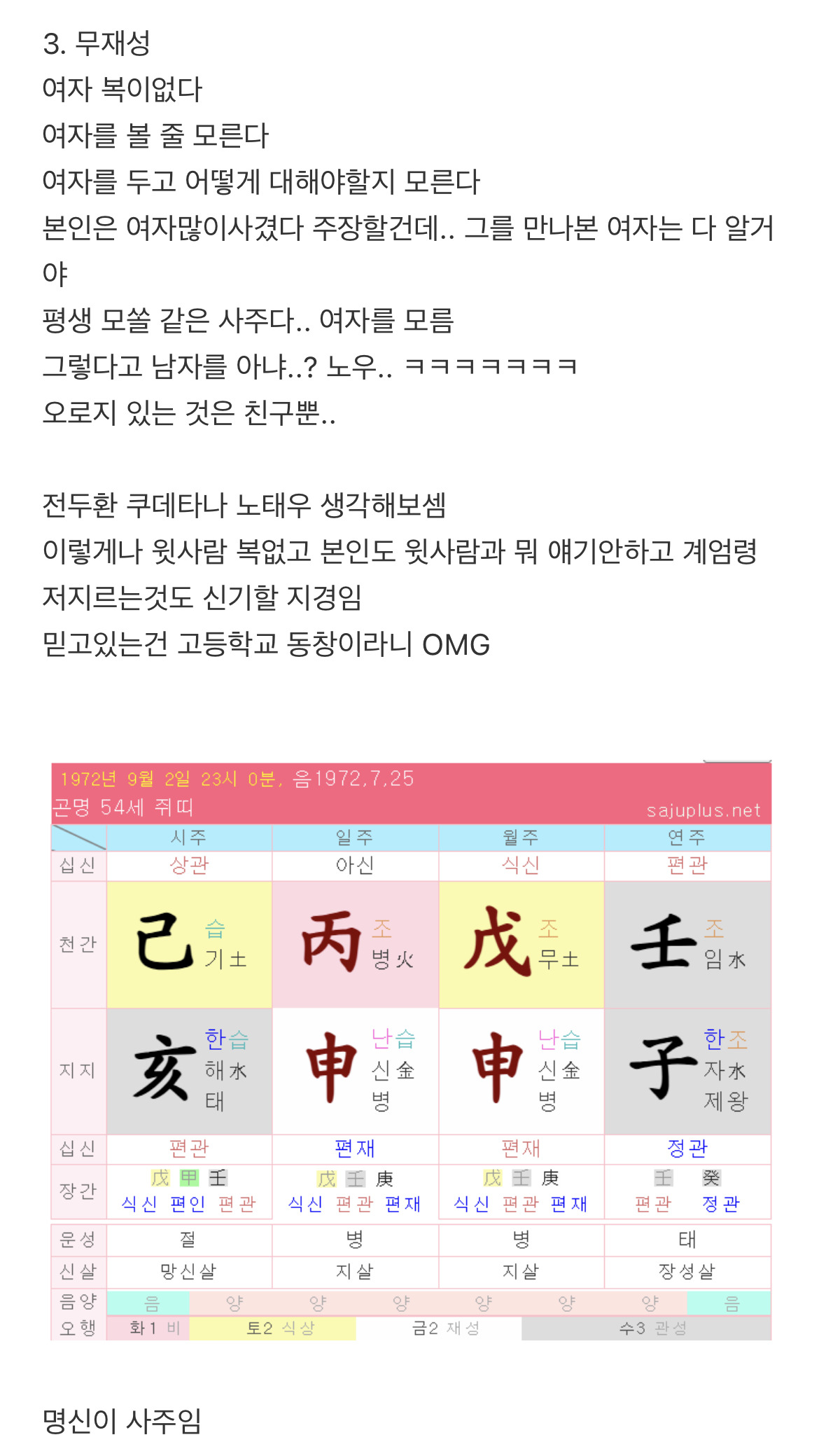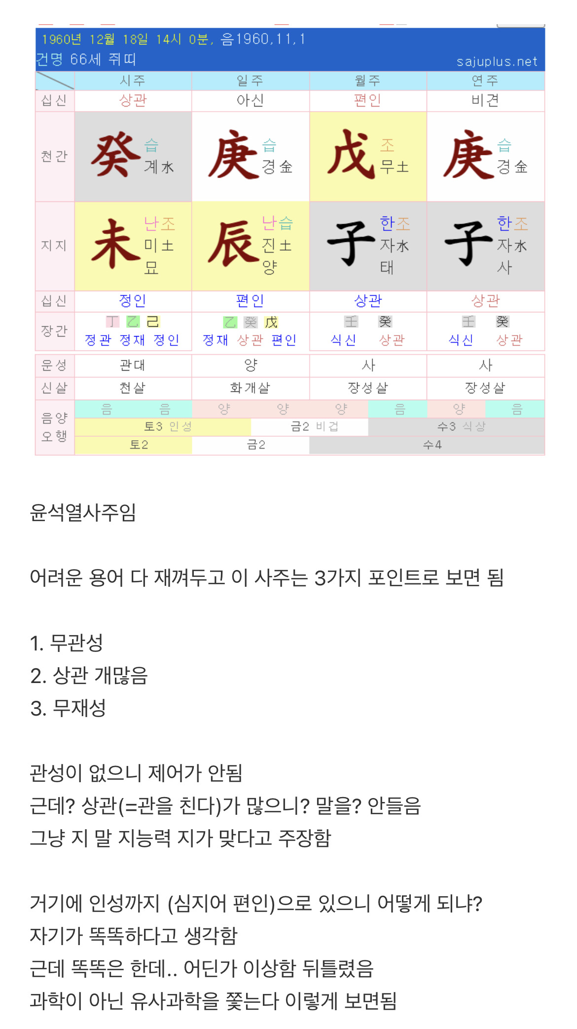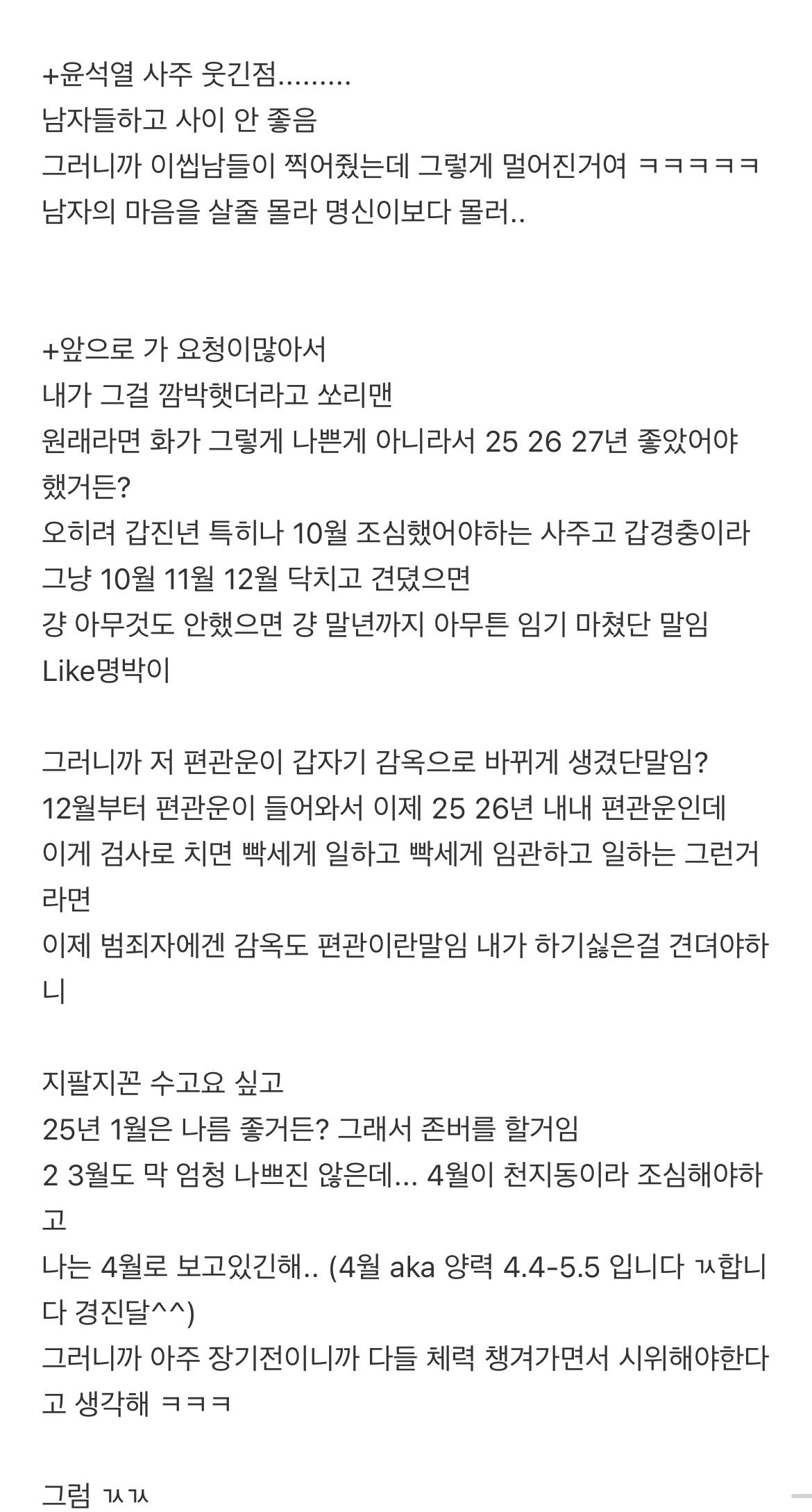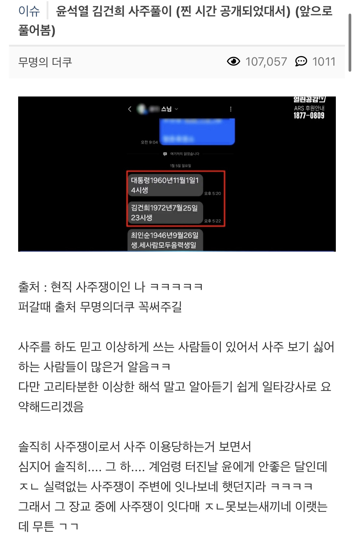 [스크랩] [흥미돋]윤석열 김건희 사주풀이 (찐 시간 공개되었대서) (앞으로 풀어봄) 작성자유재석 부캐|작성시간25.06.08|조회수16,829 목록 댓글 17 글자크기 작게가 글자크기 크게가 출처: https://theqoo.net/square/3561557948더쿠 - 윤석열 김건희 사주풀이 (찐 시간 공개되었대서) (앞으로 풀어봄)여기를 눌러 링크를 확인하세요theqoo.net1월 6일에올라온 글 다음검색 스크랩 원문 : *여성시대* 차분한 20대들의 알흠다운 공간 현재 게시글 추가 기능 열기 북마크 공유하기 신고 센터로 신고 댓글 댓글 17 댓글쓰기 답글쓰기 댓글 리스트 삭제된 댓글입니다. 답댓글 작성자방울방울은방울 | 작성시간 25.06.08 와... 신기해.. 여시 멋지다 작성자슈퍼리치 | 작성시간 25.06.08 4월4일 소름ㄷㄷ 작성자주간업무보고 | 작성시간 25.06.08 태어난시간은 어케 입수하는거임 졸라신기하네 답댓글 작성자금고 | 작성시간 25.06.08 문자에 4시생 등 나와있음 댓글 전체보기