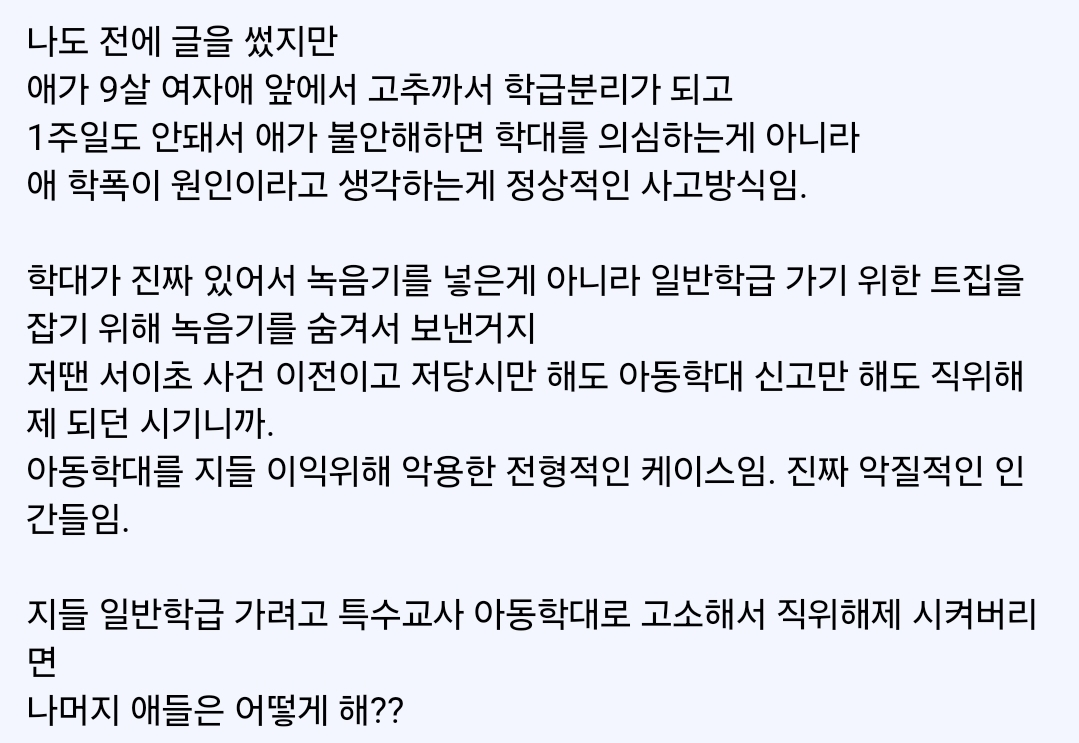 작성자선예매 작성시간 25.06.09 전학간 서울 학교에서 적응 잘 못하고 문제있는걸로 아는데 애기가 너무 안타까워.. 대체 교사랑 싸워서 얻은게 뭐야. 자폐특수아동은 더더군다나 래포쌓기가 어렵고 한번 적응된 루틴 바뀌면 아이가 더 혼란스러워할텐데.. 특수교육이라는 특이점도 생각해야지 찐 특수학교 가서 한번만 참관해봐도 모르지 않을텐데