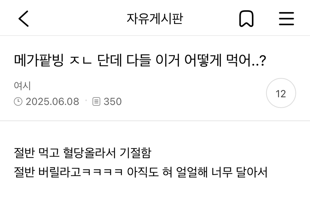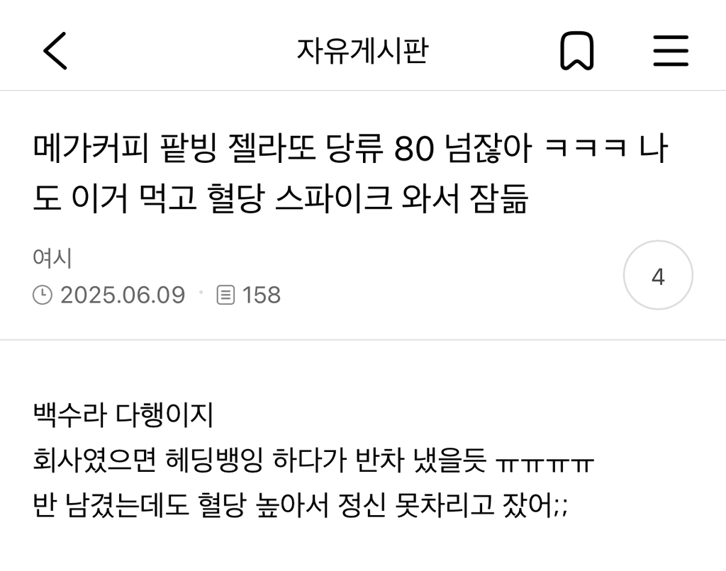 작성시간 25.06.10 나도 먹고싶은데 미친 당함량때문에 못먹고잇음ㅋㅋㅋㅋㅋ