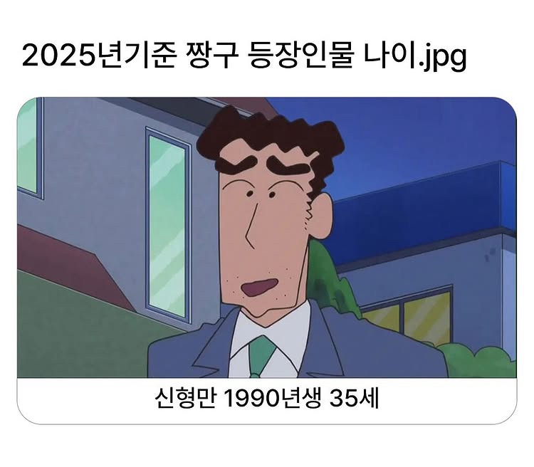 [흥미돋]2025년 기준 짱구 등장인물 나이 작성자썩열|작성시간25.06.13|조회수10,168 목록 댓글 36 글자크기 작게가 글자크기 크게가 출처: https://www.instagram.com/p/DKgGnsuT2vs 다음검색 현재 게시글 추가 기능 열기 북마크 공유하기 신고 센터로 신고 댓글 댓글 36 댓글쓰기 답글쓰기 댓글 리스트 작성자함냥함냥 | 작성시간 25.06.13 신형만 저나이에 주택 자가에 애기에 강쥐까지 대단하다 작성자내이름초코칩 | 작성시간 25.06.13 신형만이랑 두목님 빼고 다 나보다 어리네;; 작성자결벽증용사 | 작성시간 25.06.13 07이 애를? 작성자캔유필마 할트비트코인? | 작성시간 25.06.13 마 형마이 작성자Moleskine | 작성시간 25.06.14 형만헴 집 어떻게 사셨어요... 댓글 전체보기
