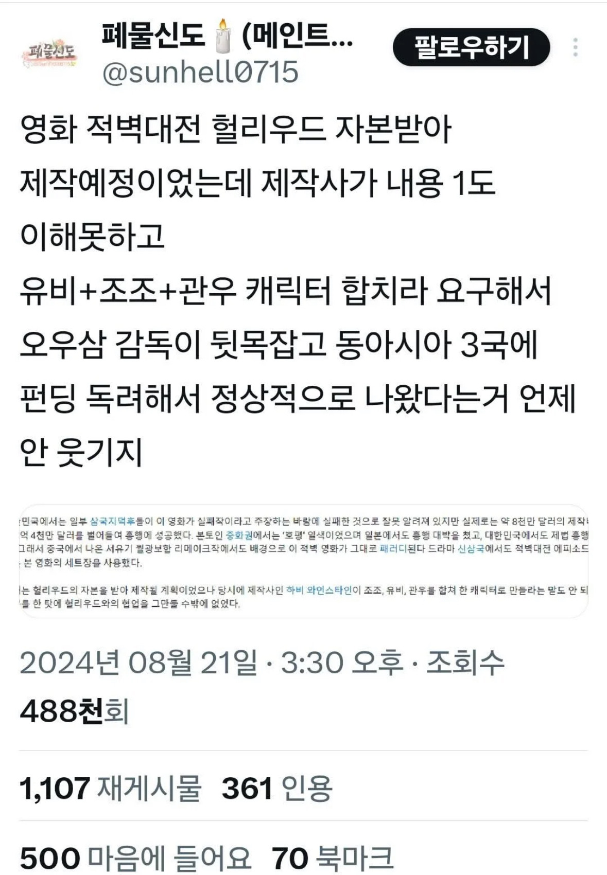 할리우드 : 투자합니다 그 대신 유비 조조 관우를 합칩시다!!!