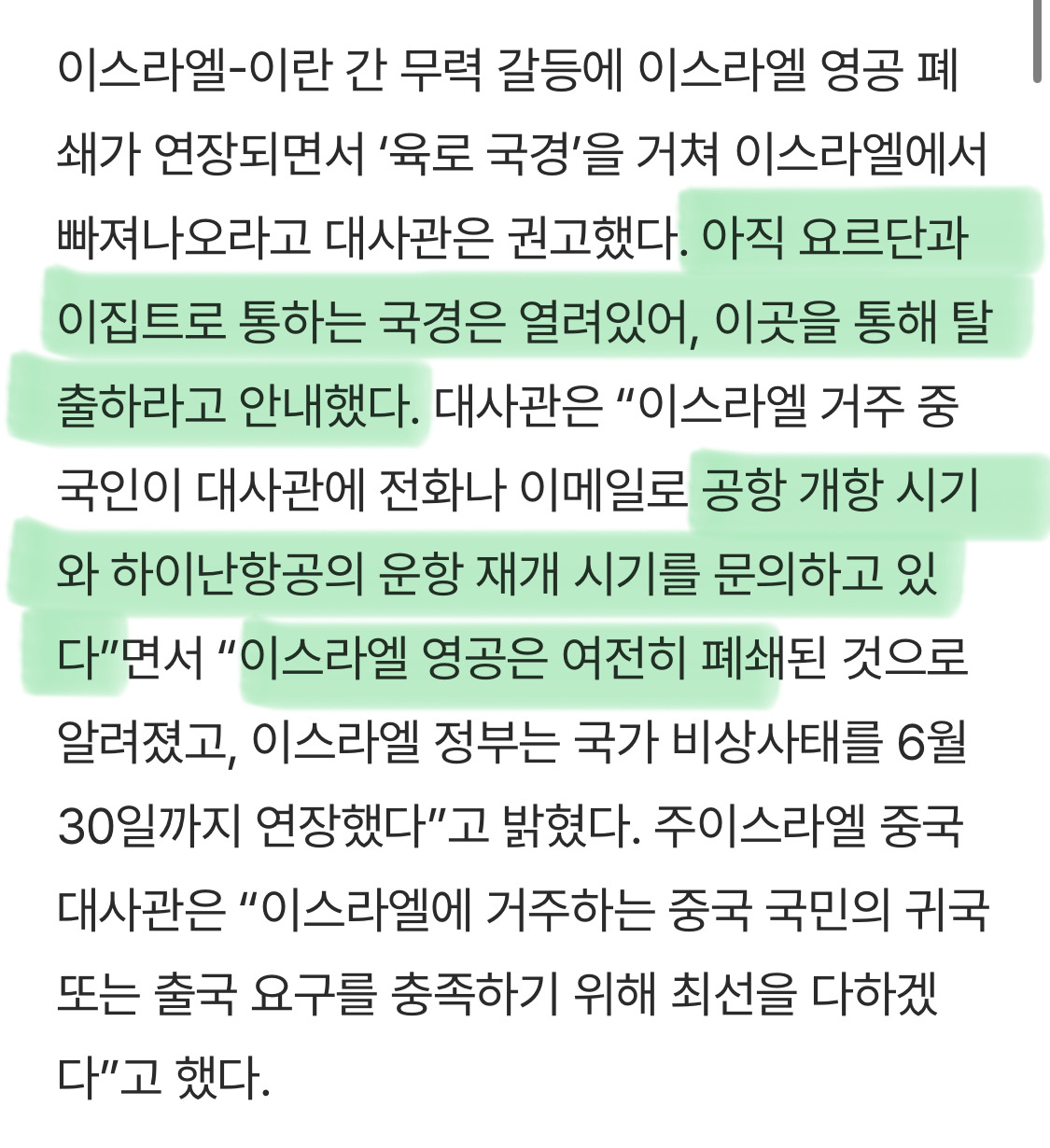 [여시뉴스데스크]“육로로, 가능한 빨리 떠나라” 주 이스라엘 중국대사관, 자국민 대피령 작성자(본인닉네임).|작성시간25.06.18|조회수3,371 목록 댓글 6 글자크기 작게가 글자크기 크게가 출처: https://www.hani.co.kr/arti/international/china/1203189.html#ace04ou 다음검색 현재 게시글 추가 기능 열기 북마크 공유하기 신고 센터로 신고 댓글 댓글 6 댓글쓰기 답글쓰기 댓글 리스트 작성자암어가나쥐 | 작성시간 25.06.18 아 미쳤나 왜이래 진짜...그만들해ㅠㅠㅠ하... 작성자블루꽃 | 작성시간 25.06.18 헐 작성자맵싀짱 | 작성시간 25.06.18 아 진짜 ㅠㅠ 전쟁하지 말라고.. 작성자이길로갈게 | 작성시간 25.06.18 이게 무슨... 작성자돈이모지 | 작성시간 25.06.18 이거짐짜 무서워 댓글 전체보기