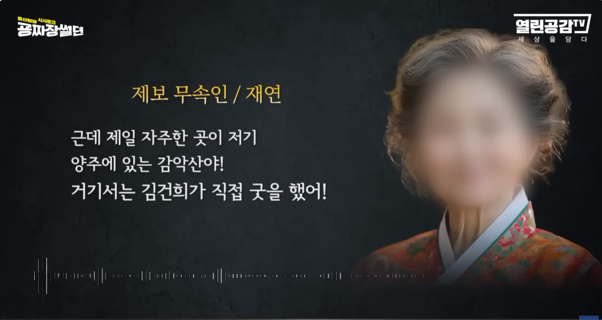 | 영상제목 & 출처 | 김건희가 떼로 굿을 했다는 장소, 돼지 사체와 삼지창이!!! https://youtu.be/mJZ8UuqUnso?si=PsG7iGXYg4tgtjai | "소개자가 누군데?" 김건희가 갔다 왔다는 계룡산 굿당!!! https://youtu.be/09h62hUfcLk?si=xREAfK1UOqsYrBol |