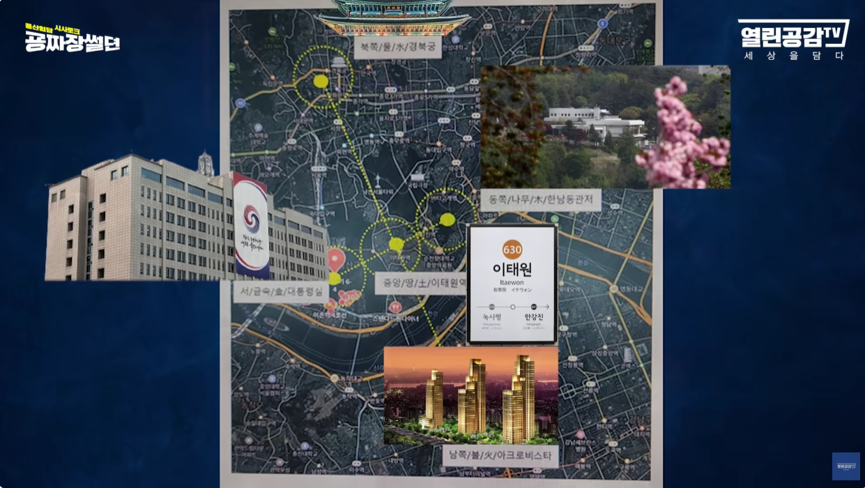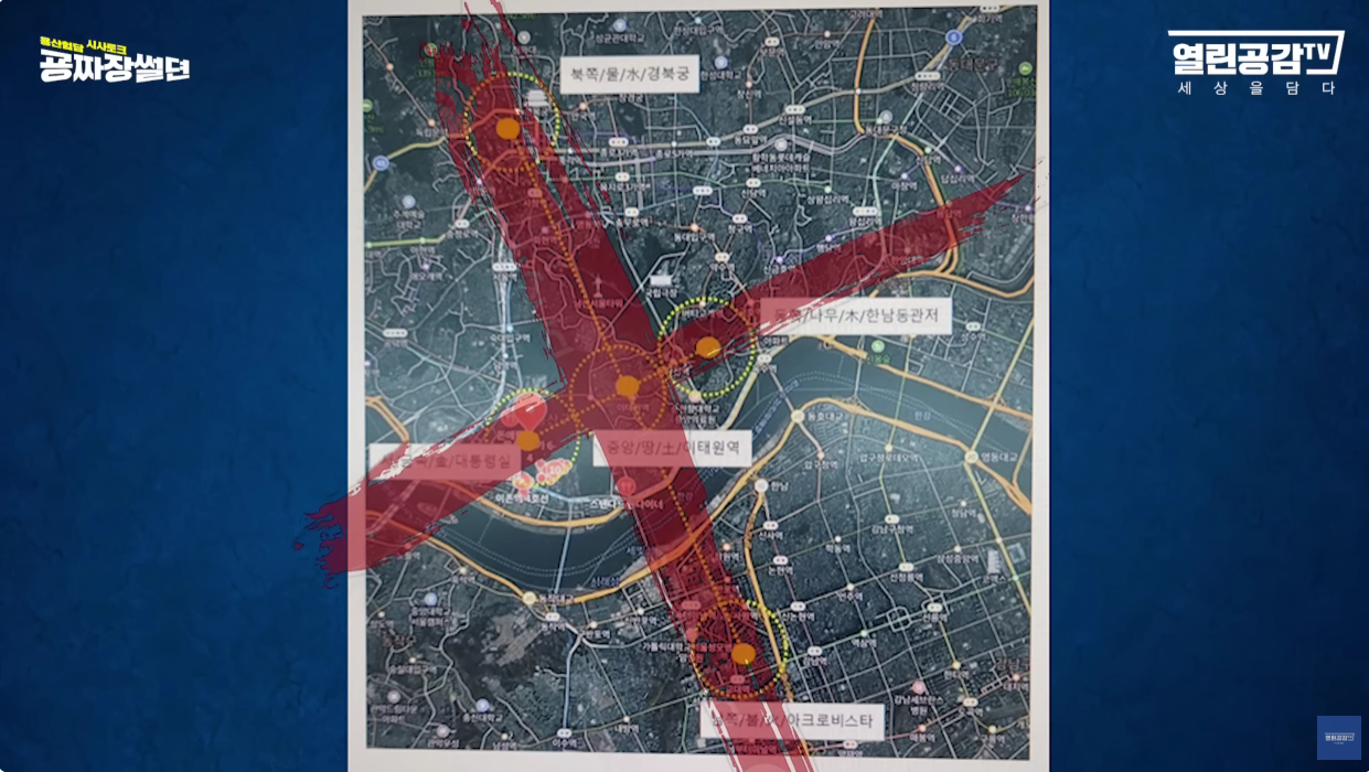 | 설명 | 오방신 (동남중서북의 위치) | 주술과 관련된 분홍색 (삼풍백화점=김건희 일가 선산 건물) |