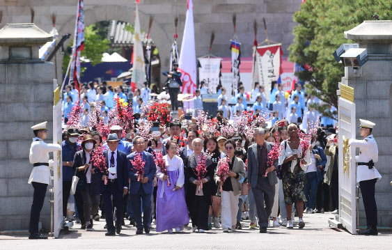| 74명의 국민대표단이 매화꽃을 들고 청와대 개방 행사 입장 | 열린공감TV = 열공TV |