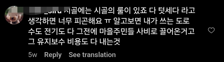 작성시간 25.06.21 시골에 잡혀있는 전기, 수도, 인터넷, 도로 등 다 예전부터 마을 사람들이 돈 모아서 설치해놓은 거니까 내는 게 맞지 그게 싫으면 도시에서 관리비 내고 사시면 되겠습니다