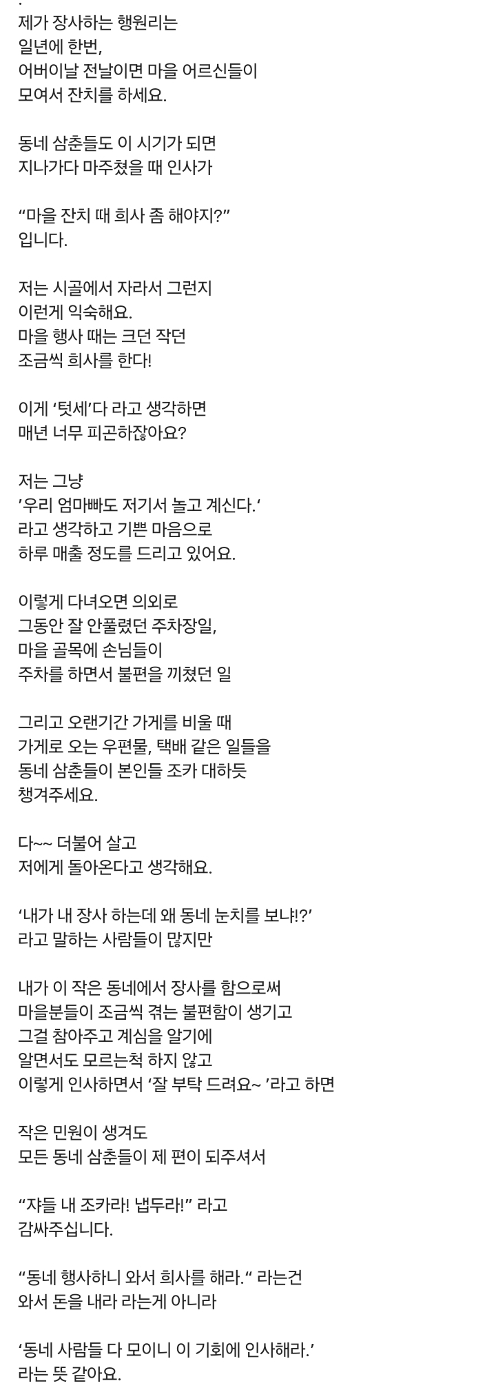 작성시간 25.06.21 도시는 세금이 많이 걷히니까 지자체에서 문제 해결을 해주거나 축제 열거나 하지만 시골은 그게 어려우니까 주민들끼리 모아서 하는 느낌인건가?