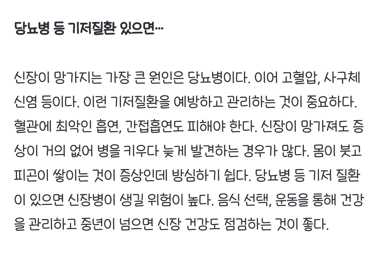 작성시간 25.06.23 신장 안좋으면 잡곡ㄴ 초록색많은풀ㄴ 과일도 골라먹어야하고 염분ㄴ 갈증나니까 물 벌컥벌컥ㄴ 진짜 음식 평생 가리고 살아야함....