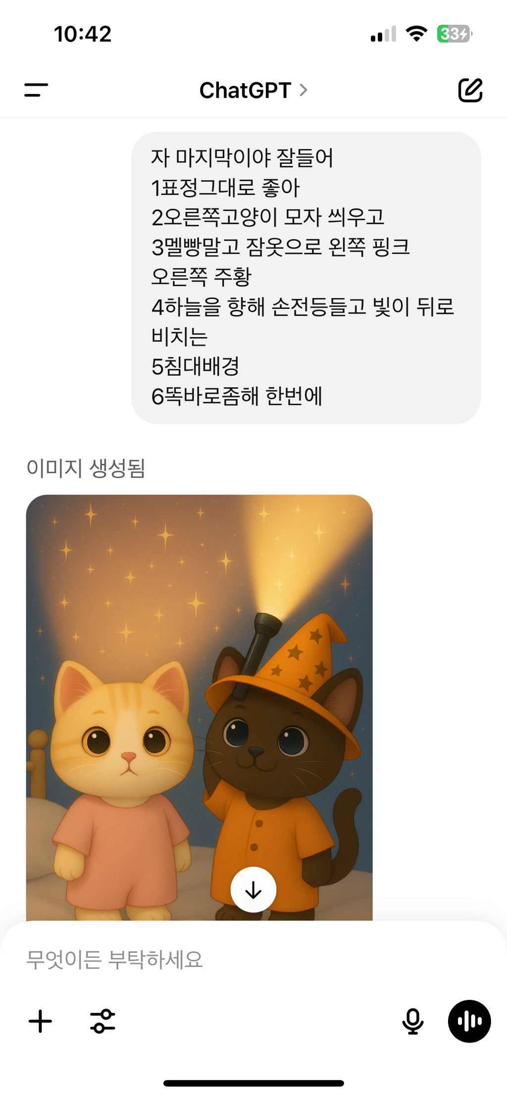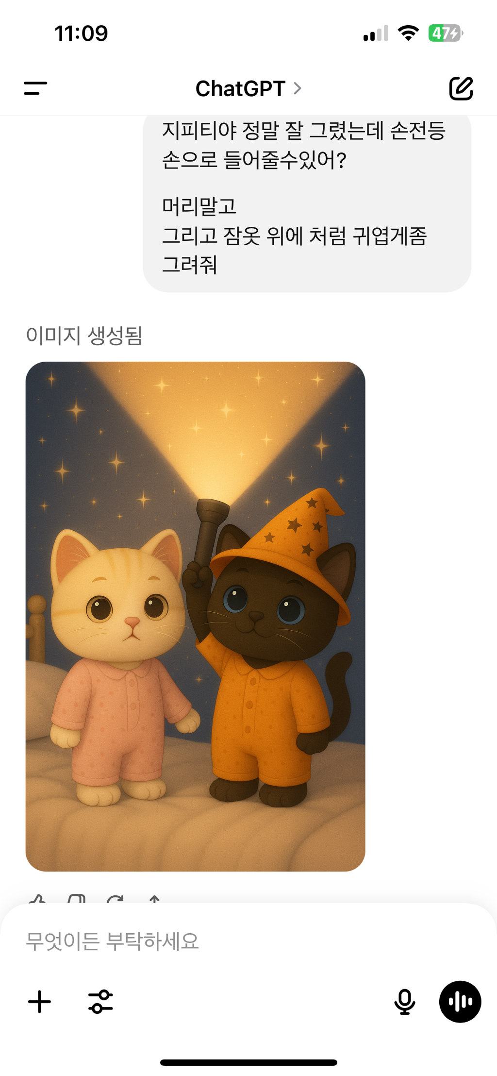 작성시간 25.06.26 나 이거 한 방에 그려진 건데 예시 10개를 우르르 보내고 ‘우리 고양이 사진으로 이 그림들처럼 그려줄 수 있어?‘ 하면 그려준다고 함 그러고 나서 댕냥이 사진 여러개 (얼굴 위주) 보내주면서 침대/잠옷색/손전등색/빛색깔 이런 거 같이 보내주면 바로 그려주더라~~~