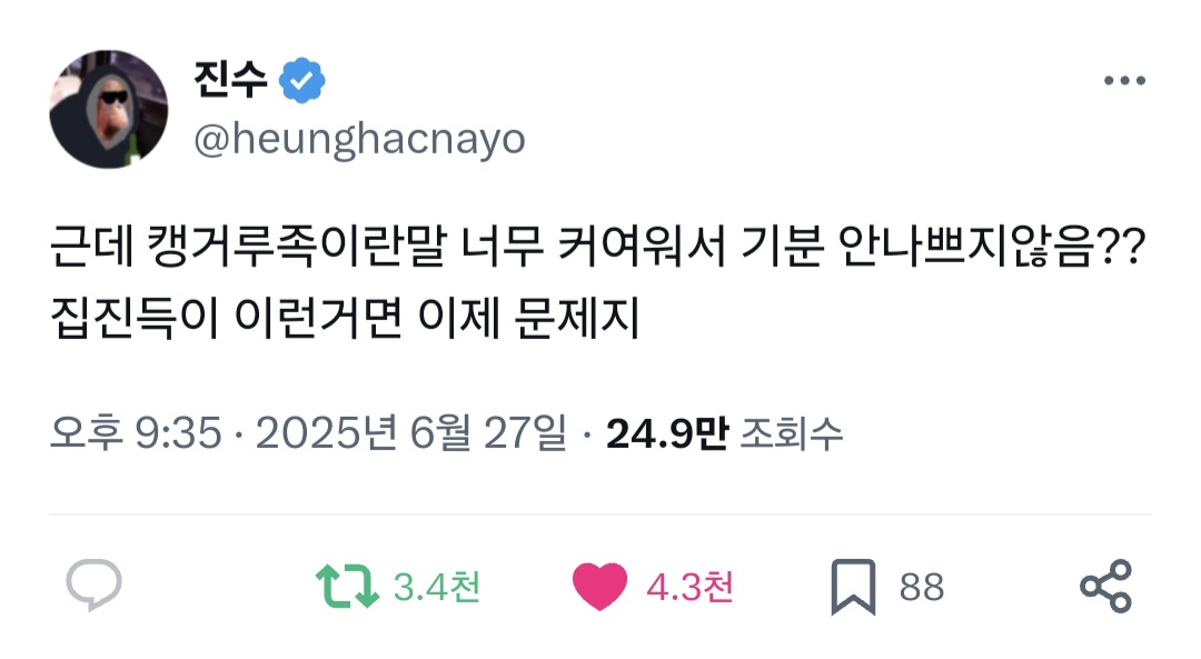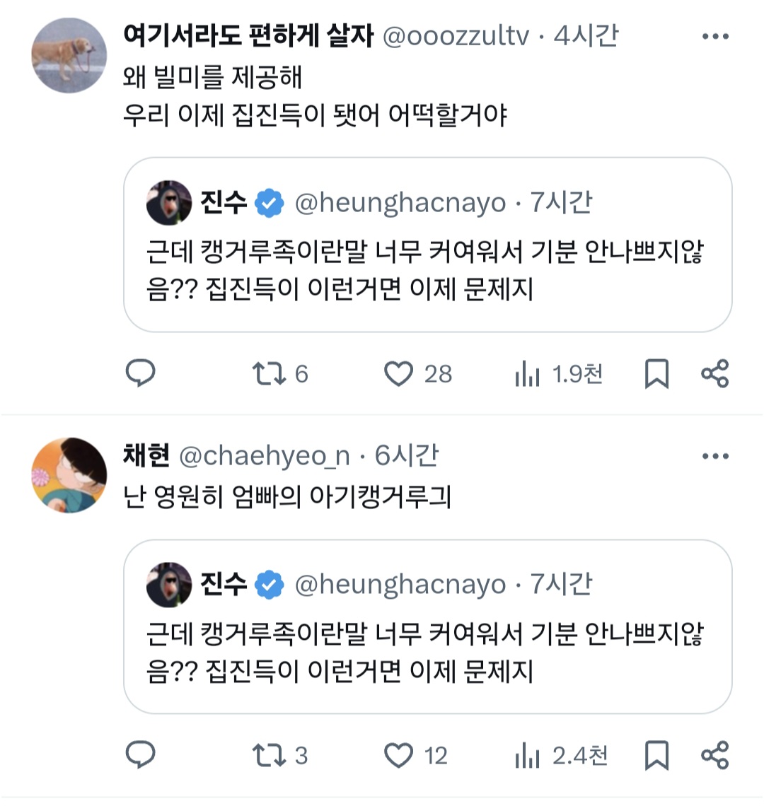 *여성시대* 차분한 20대들의 알흠다운 공간 [흥미돋]근데 캥거루족이란말 너무 커여워서 기분 안나쁘지않음??.twt 작성시간25.06.28|조회수63,007 목록 댓글 70 글자크기 작게가 글자크기 크게가 출처: https://x.com/heunghacnayo/status/1938576858364477586?t=V6RT45DvRvOvcDaBfPrAZg&s=19 다음검색 현재 게시글 추가 기능 열기 북마크 공유하기 신고 센터로 신고 댓글 70 댓글 리스트 작성시간 25.06.28 ㅋㅋㅋㅋ집진득이도 말이 귀엽다 작성시간 25.06.28 캥 작성시간 25.06.28 ㅋㅋㅋ집진득이 너무 귀여운데ㅋㅋ 작성시간 25.06.28 캥🤭 작성시간 25.06.28 진드기인데… 진득하니 앉아 있다는 뜻인가..일부러 틀린 건지 아니면 몰라서 저러는 건지.. 카페 방문해 더 많은 댓글 만나기!