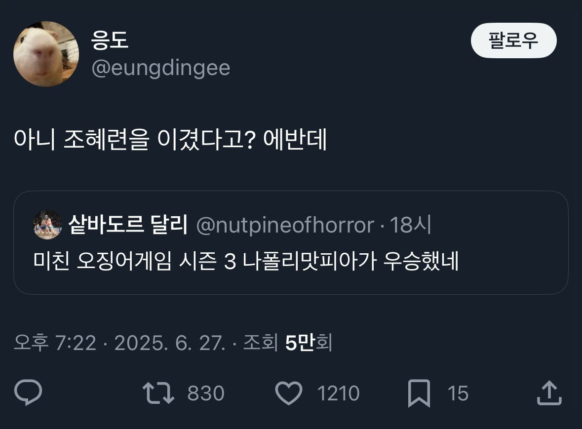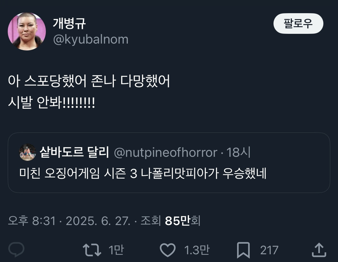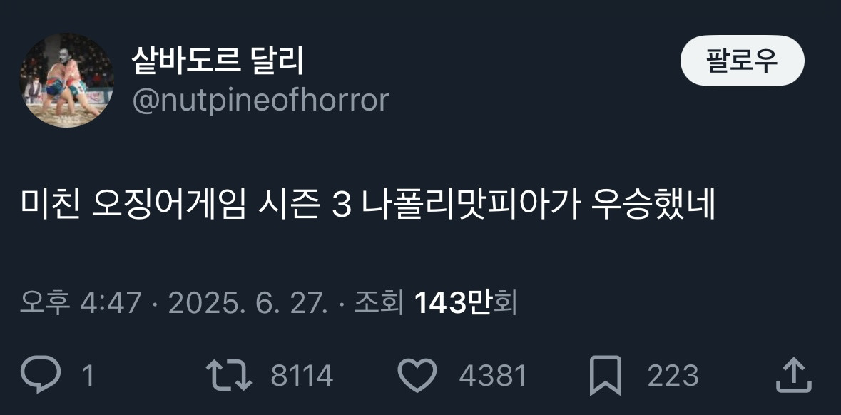 *여성시대* 차분한 20대들의 알흠다운 공간 [흥미돋]미친 오징어게임 시즌 3 나폴리맛피아가 우승했네 작성시간25.06.28|조회수38,500 목록 댓글 44 글자크기 작게가 글자크기 크게가 출처: https://www.dmitory.com/issue/371327741 다음검색 현재 게시글 추가 기능 열기 북마크 공유하기 신고 센터로 신고 댓글 44 댓글 리스트 작성시간 25.06.28 ㅋㅋㅋㅋㅋㅋㅋㅋㅋㅋㅋㅋㅋㅋ웃겨 작성시간 25.06.28 서인국 아님??? 작성시간 25.06.28 아니 당가니엘이 1등 아님? 작성시간 25.06.29 아진짜 어이없네ㅠㅋㅋㅋㅋㅋㅋㅋ 작성시간 25.06.29 장도연 응원했는데......... 카페 방문해 더 많은 댓글 만나기!
