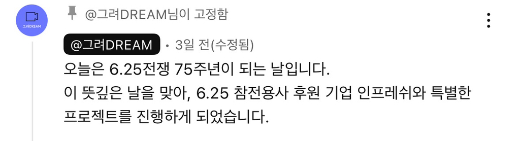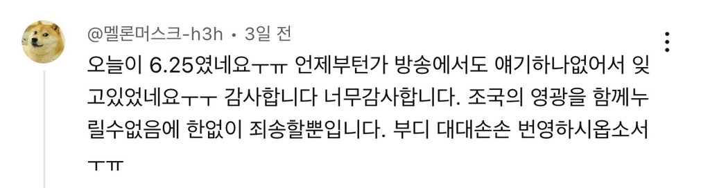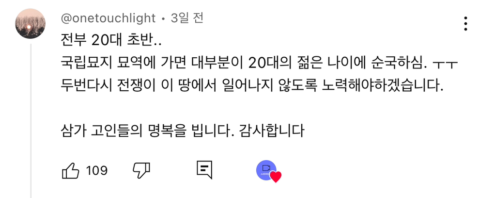 *여성시대* 차분한 20대들의 알흠다운 공간 [눈물한방울]꽃다운 청춘에 돌아가신 6.25 참전용사 작성시간25.06.28|조회수21,464 목록 댓글 12 글자크기 작게가 글자크기 크게가 출처: https://youtube.com/shorts/T1aolL7SDBw?si=uSkxFSKHNDYPKnpY 다음검색 현재 게시글 추가 기능 열기 북마크 공유하기 신고 센터로 신고 댓글 12 댓글 리스트 작성시간 25.06.29 저 한사람 한사람의 용기들이 모여서 북이 내려오는 속도를 많이 막은거겠지… 작성시간 25.06.29 너무 어리다…..감사합니다 편히 쉬세요 작성시간 25.06.29 젊은나이라서 더안타까운 마음이,,,감사합니다 작성시간 25.06.29 너무 어리다.. 작성시간 25.06.29 너무어리다 카페 방문해 더 많은 댓글 만나기!