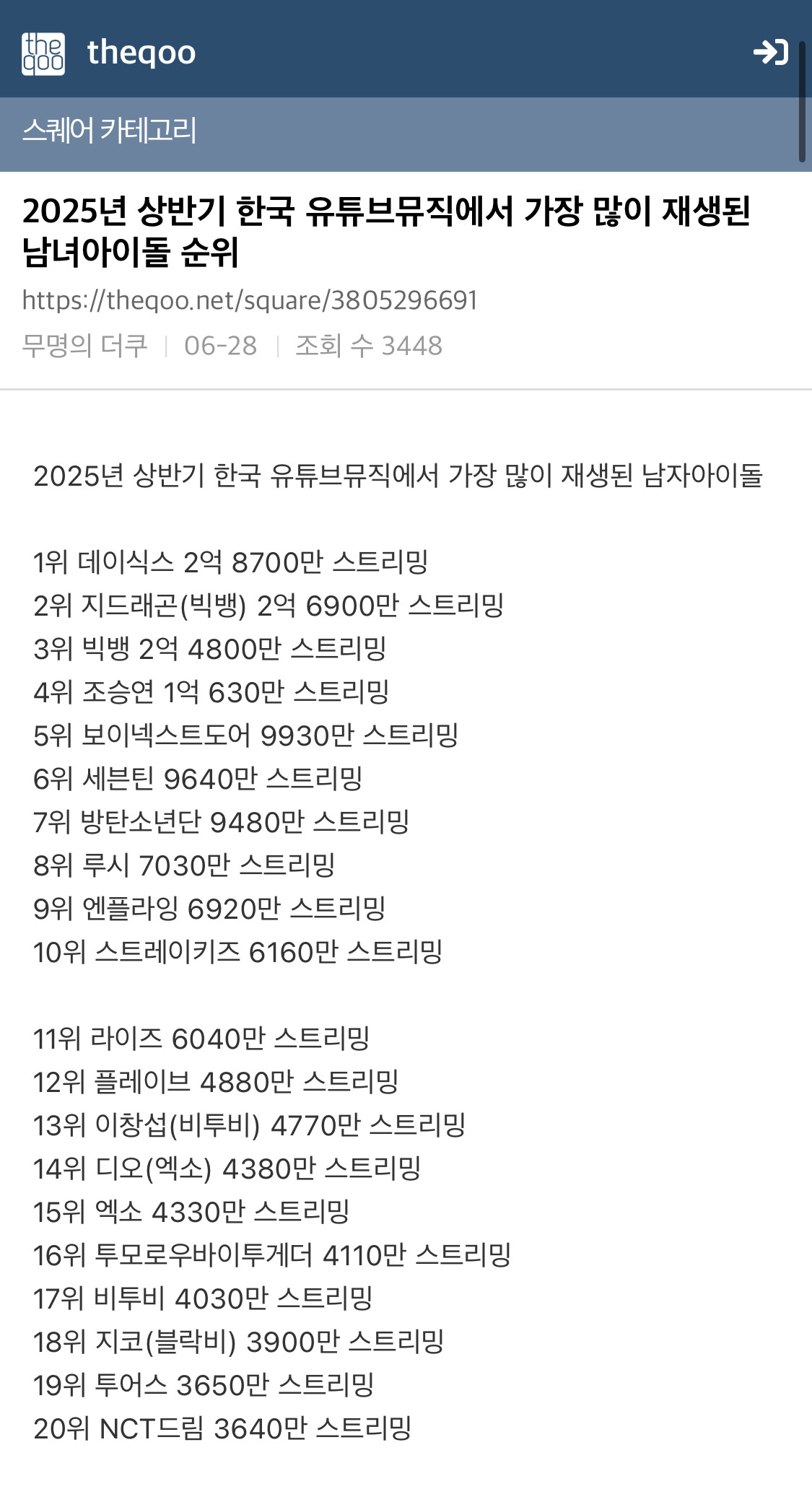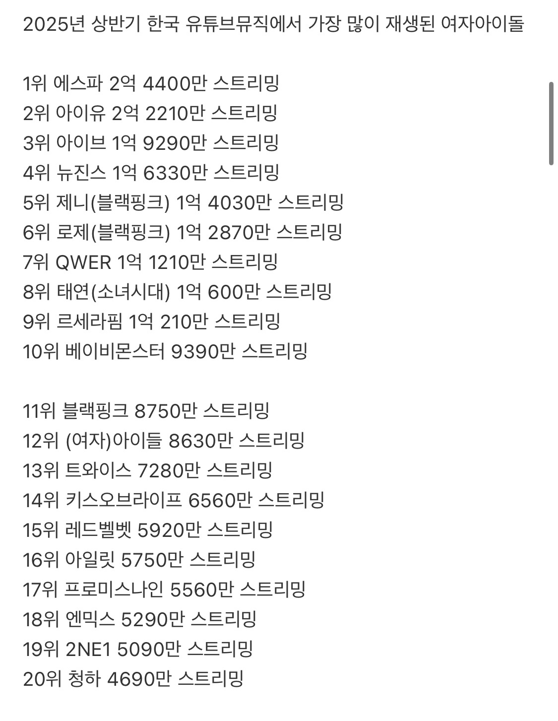 [흥미돋]2025년 상반기 한국 유튜브 뮤직에서 가장 많이 재생된 남녀아이돌 순위