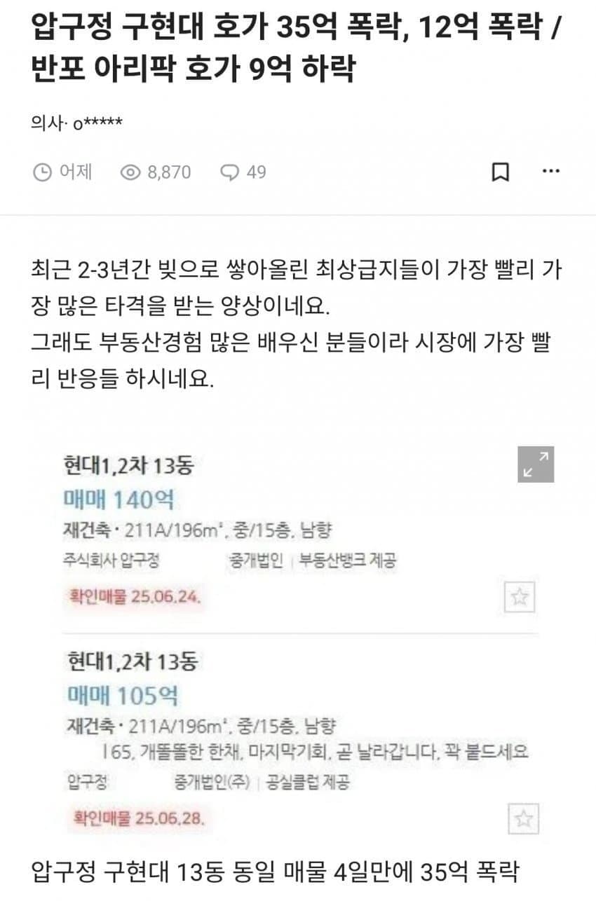 *여성시대* 차분한 20대들의 알흠다운 공간 [흥미돋]압구정 현대아파트 140억->105억 하락 작성시간25.06.30|조회수57,362 목록 댓글 537 글자크기 작게가 글자크기 크게가 출처: https://theqoo.net/square/3806957176 다음검색 현재 게시글 추가 기능 열기 북마크 공유하기 신고 센터로 신고 댓글 537 댓글 리스트 작성시간 25.07.01 더 빠져라 작성시간 25.07.01 아파트 집값이 100억이 넘늨다는게 그냥놀랍다 작성시간 25.07.01 ㅋㅋㅋㅋㅋㅋㅋㅋㅋㅋ100억??ㅋㅋㅋㅋㅋㅋㅋㅋㅋㅋㅋㅋㅋㅋㅋ 작성시간 25.07.02 105억? 더 내려 ㅅㅂ 작성시간 25.07.10 ㅋㅋㅋㅋㅋㅋㅋㅋㅋㅋㅋㅋㅋㅋㅋㅋㅋㅋ 카페 방문해 더 많은 댓글 만나기!