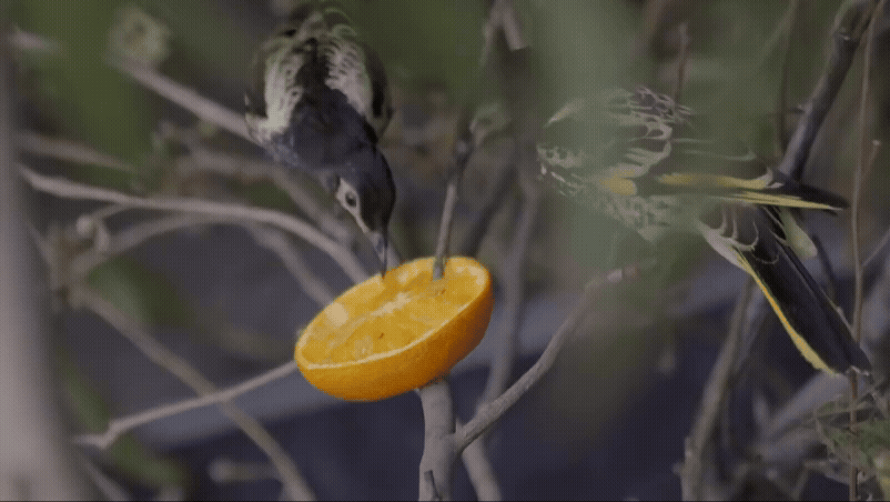 (과일을 빨아먹고 있는 리젠트꿀빨이새. 먹는 모습을 보면 왜 이름이 꿀빨이새인지 알 수 있다)