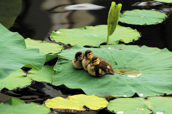 (연잎 위에서 휴식을 취하는 새끼 원앙들)