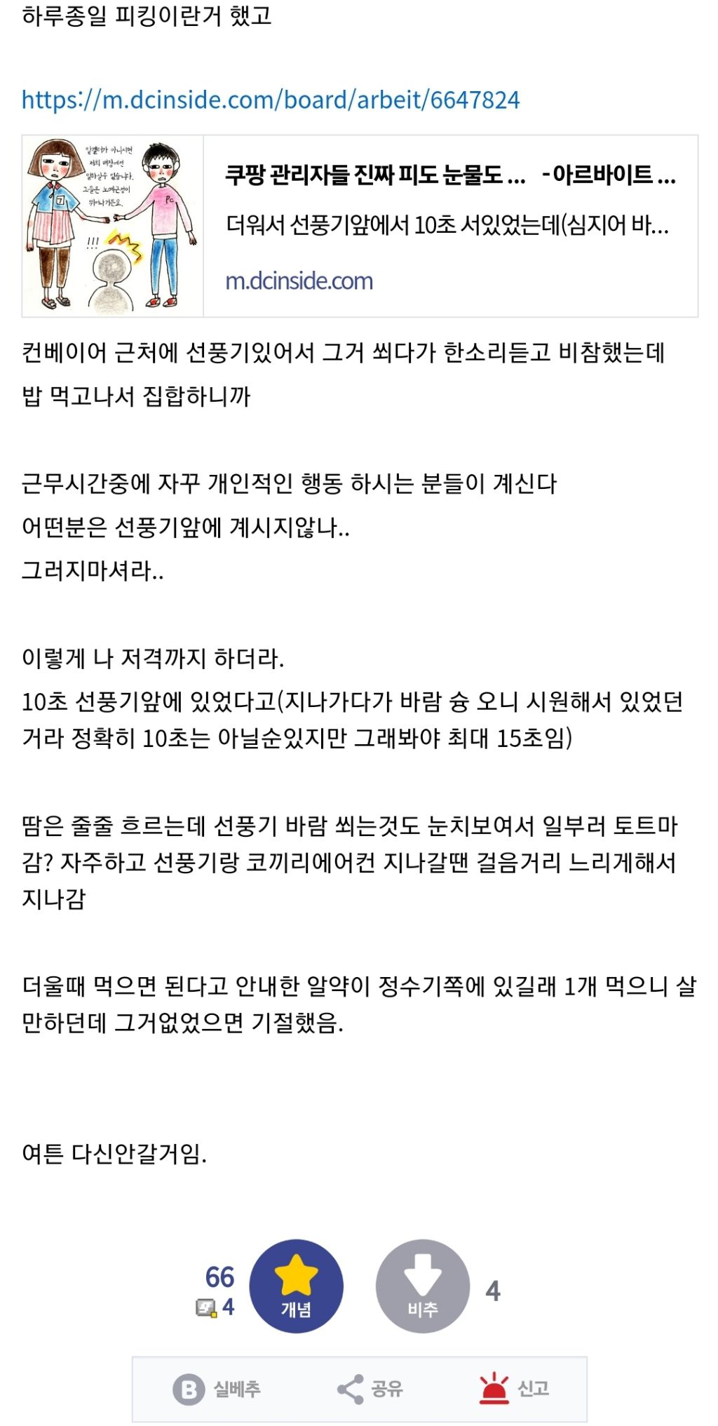 작성자804호 작성시간 25.07.02 포도당캔디 그거 별 효과도 없었음 퇴근할때 검정티에 다들 소금결정 생겨서 짠내나고 진짜 개빡쳐 순창고추장 5kg 128개 들어오면 당연히 사람이 1분 이상은 쉬고싶지않겠냐 나쁜것들...