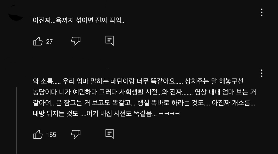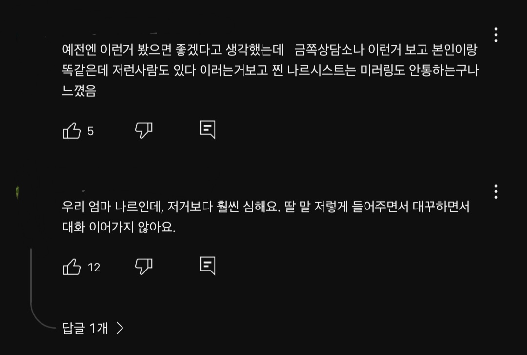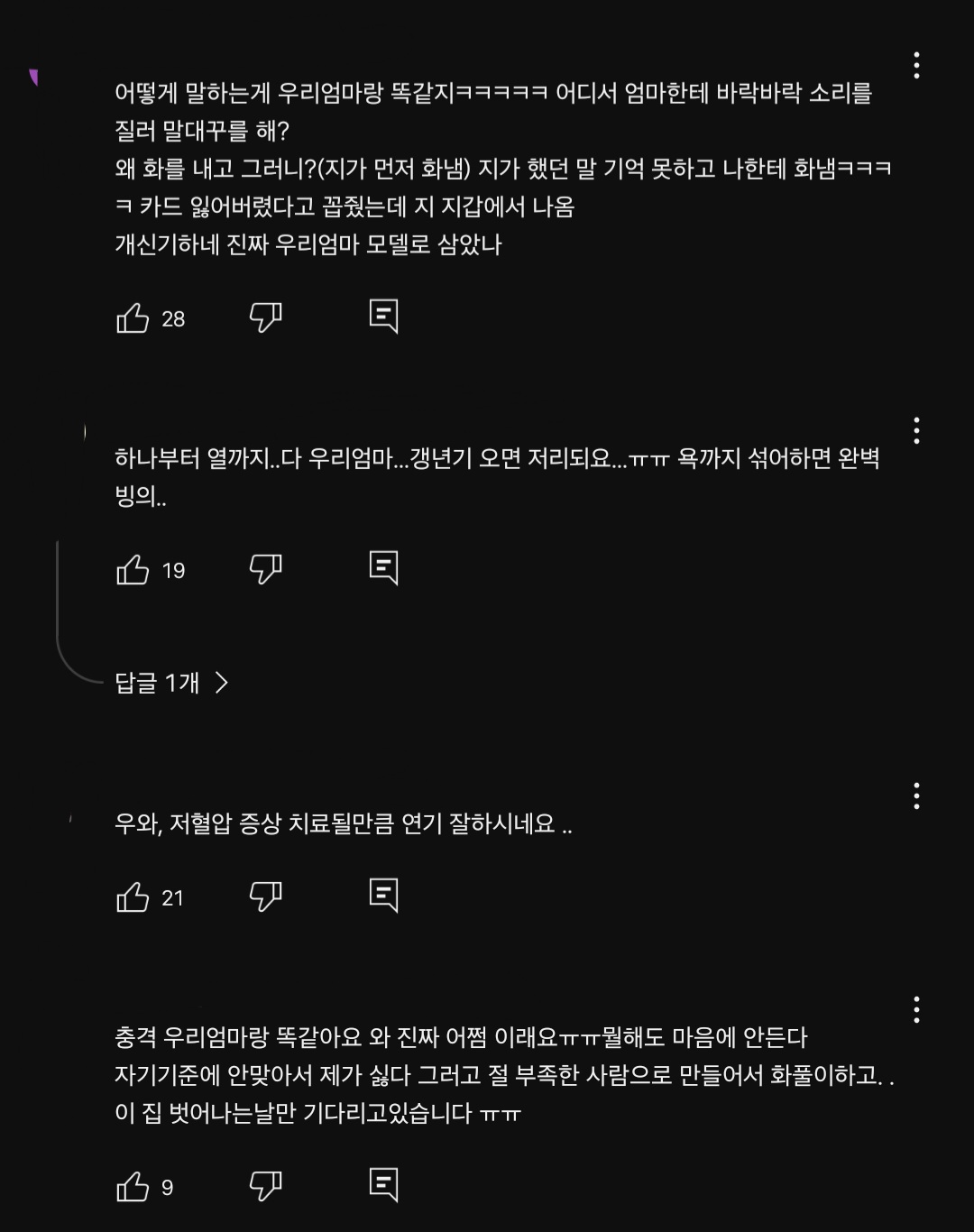 젼언니라는 유튜버인데 나르시스트 엄마 연기를 엄청 잘하셔서