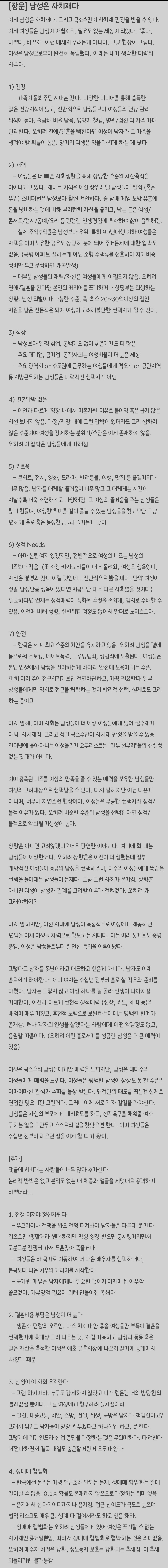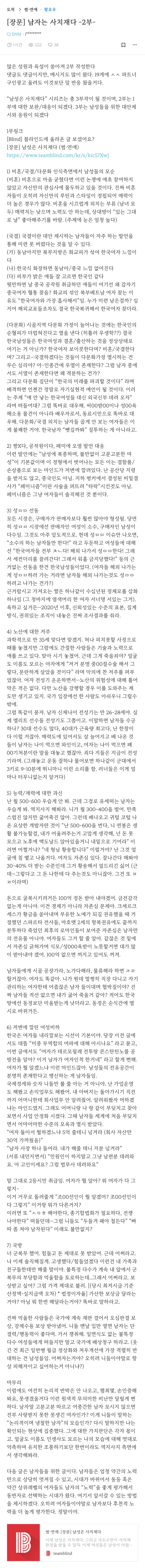 [스크랩] [흥미돋]블라인드에서 700플 가까이 달린 글 -남성은 사치재다- 작성자라이도|작성시간25.07.05|조회수9,580 목록 댓글 49 글자크기 작게가 글자크기 크게가 출처: https://www.teamblind.com/kr/post/[%EC%9E%A5%EB%AC%B8]-%EB%82%A8%EC%84%B1%EC%9D%80-%EC%82%AC%EC%B9%98%EC%9E%AC%EB%8B%A4-kic57XwJ 1부 댓글 700개임 2부https://www.teamblind.com/kr/post/[%EC%9E%A5%EB%AC%B8]-%EB%82%A8%EC%9E%90%EB%8A%94-%EC%82%AC%EC%B9%98%EC%9E%AC%EB%8B%A4--2%EB%B6%80--0mpJQtdH?utm_source=share&utm_medium=normal&from=share_link 3탄은 남자들을 위한 글이 라고 했음!! 다음검색 스크랩 원문 : *여성시대* 차분한 20대들의 알흠다운 공간 현재 게시글 추가 기능 열기 북마크 공유하기 신고 센터로 신고 댓글 댓글 49 댓글쓰기 답글쓰기 댓글 리스트 작성자뿡박사 | 작성시간 25.07.06 감탄이 절로 나온다 여러번 정독해야지 작성자세바스찬스탠 | 작성시간 25.07.06 똑똑해서 미치겠다 정말.... 작성자당신을 본 적은 없지만 응원합니다 | 작성시간 25.07.06 정말 내마음 작성자어쩌면 이건 | 작성시간 25.07.06 조목조목 맞는 말 뿐이야 작성자토끼보다 귀여운 우리 애기 | 작성시간 25.07.14 맞말 댓글 전체보기