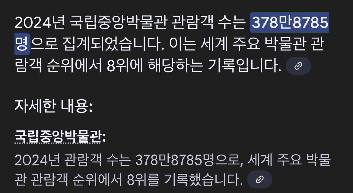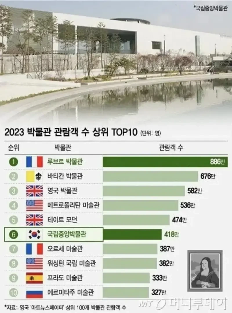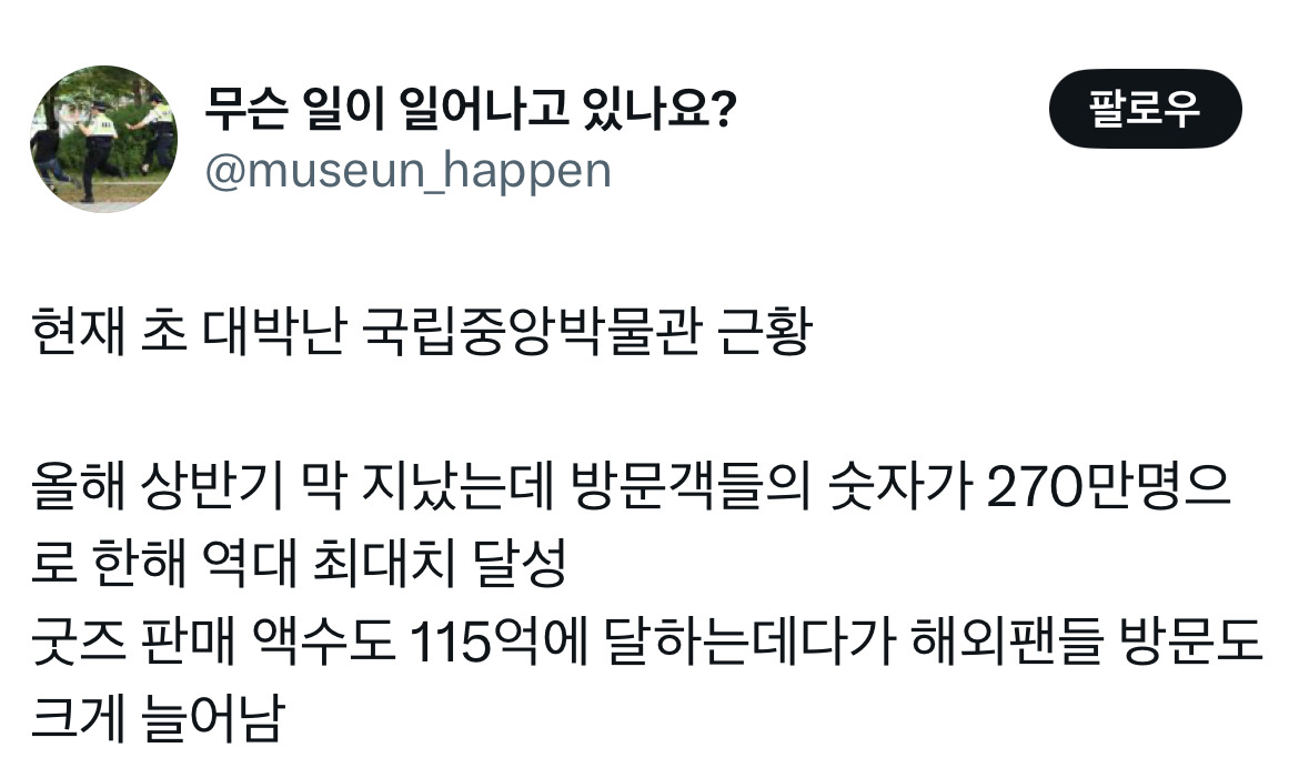 [흥미돋]국립중앙박물관 근황.jpg 작성자RKID|작성시간25.07.06|조회수112,439 목록 댓글 283 글자크기 작게가 글자크기 크게가 출처: https://x.com/museun_happen/status/1941723895364714669?s=46&t=Ubli_gnZh_-8ygJj650pCg 근데 진짜 외국인 개많음 ㄷㄷ 다음검색 현재 게시글 추가 기능 열기 북마크 공유하기 신고 센터로 신고 댓글 댓글 283 댓글쓰기 답글쓰기 댓글 리스트 작성자호잇이이이 | 작성시간 25.07.07 진짜 멋지다 우리나라 자랑스러워요 작성자우즈즈 | 작성시간 25.07.07 입장료 받아야지;; 작성자윤썩열뒤져라 | 작성시간 25.07.07 입장료 소정이라도 받으면 좋겠다 다른 해외는 자국민의 6-10배 받던데 작성자메론주스 | 작성시간 25.07.07 입장료를 받으면 나라살림에 참 보탬이 될텐데... 작성자저는곰머 | 작성시간 25.07.07 약탈 문화재 하나 없이 세계에서 저 순위인게 존나 대단함. 가끔 멍때리러가면 좋더라고. 댓글 전체보기