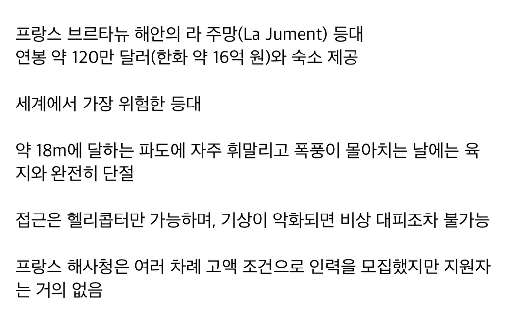 [흥미돋]연봉 16억짜리 직업인데 가능? 작성자우르롻끼|작성시간25.07.10|조회수72,845 목록 댓글 224 글자크기 작게가 글자크기 크게가 출처: 여성시대 우르롻끼하는 일: 밤 되면 등대 불 켜기. 해 뜨면 등대 불 끄기. 등대 지키기계약은 1년 단위 (중도 포기시 돈 X)1년에 한 번씩 며칠간만 육지로 나갈 수 있음생필품 및 음식은 주 1회 헬기가 실어다 줌아직은 근무 중에 사망 한 사람 없음인터넷 가능하지만 종종 끊김방 안에 에어컨, 히터, 침대 있음 다음검색 현재 게시글 추가 기능 열기 북마크 공유하기 신고 센터로 신고 댓글 댓글 224 댓글쓰기 답글쓰기 댓글 리스트 작성자니탄생석 편도결석 | 작성시간 25.07.11 자동화 하면 되자나 작성자아아는사랑 | 작성시간 25.07.11 찾아보니까 자동화된지오래됬네쩝날보내조요 작성자2029년까지10억벌여시 | 작성시간 25.07.11 당연히 자동화 생각했어,, 저걸왜인간이ㅠㅋㅋㅋㅋㅋㅋ 작성자고박 호구마 | 작성시간 25.07.11 굳이 사람이 필요해….? 작성자짜증나는칫솔 | 작성시간 25.07.12 좋아! 죽어도 연봉은 줄거지? 보험금이랑 다 엄빠한테 갈테니까 댓글 전체보기