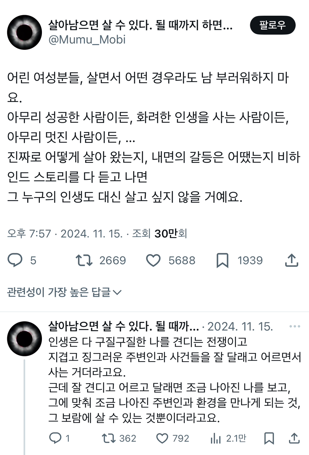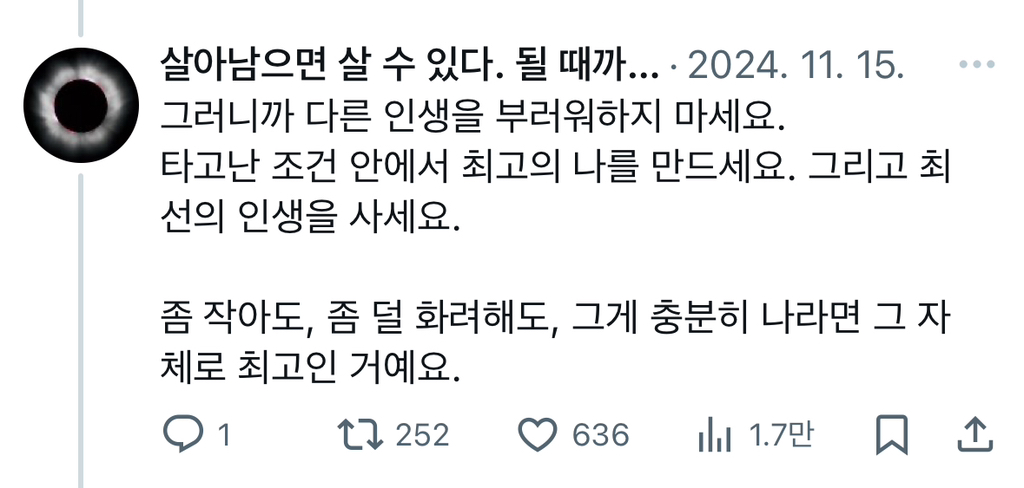 작성자느ㅣ개비최종학력리박스쿨 작성시간 25.07.14 사회적으로 좋다고 생각되는 것들 다 쟁취했어도 그게 무조건 행복을 보장하는게 아니더라고... 내맘 편하고 내인생 만족스러운게 최고야