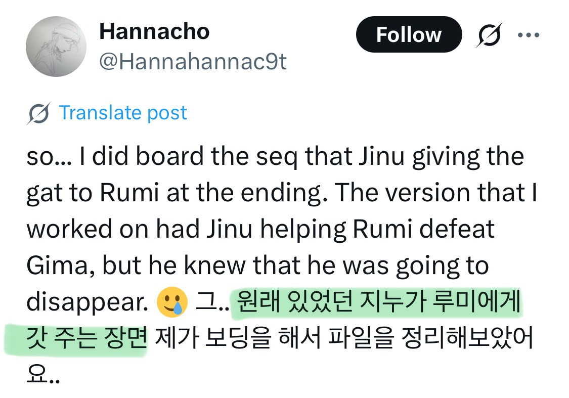 작성자박규리 작성시간 25.07.15 오 안해서 다행이긴하다 ㅋㅋ 헌트릭스 우정회복이랑 루미성장에 집중된게 더 좋아 제발 속편나올거면 진우부활이니뭐니 이상한 시도 하지말고 새로운 적이랑 뒤지게 싸우길 미라랑 조이 이야기 조금 더 저세히 풀어주면 고맙고 아님 전세대 이야기도 좋아
