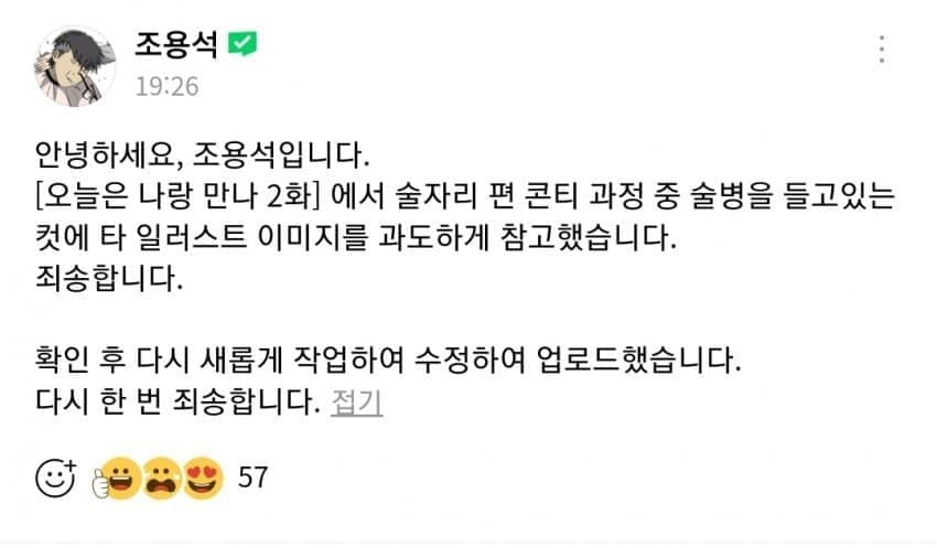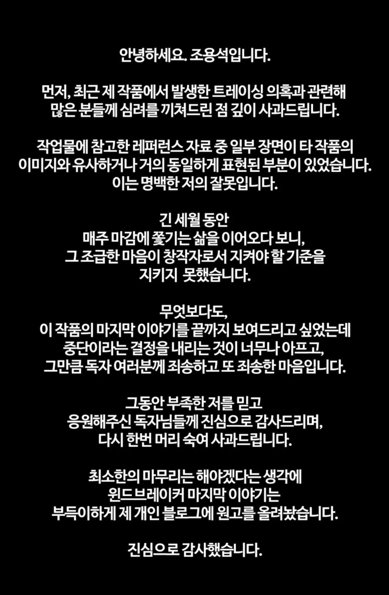 작가는 이에 대해 타작가의 그림을 트레이싱했다는 것을 인정하며 사과문을 게시했고 마지막화를 개인 블로그에 업로드하기로 함.