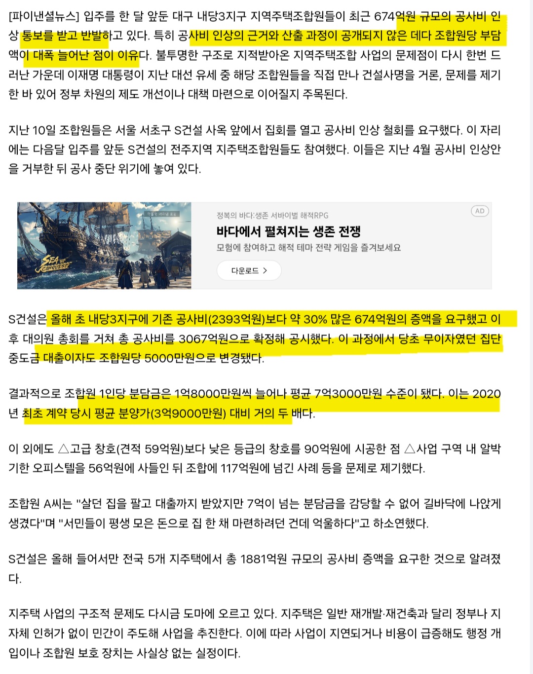 3억으로 분양받았던 조합원 아파트가 7억을 내놓으라고 한다며 관심을 가져달라고