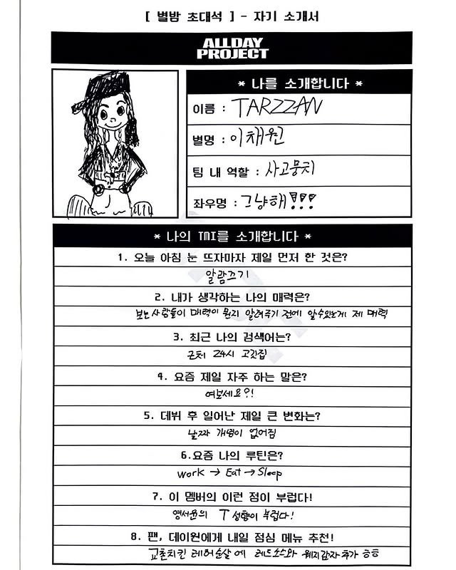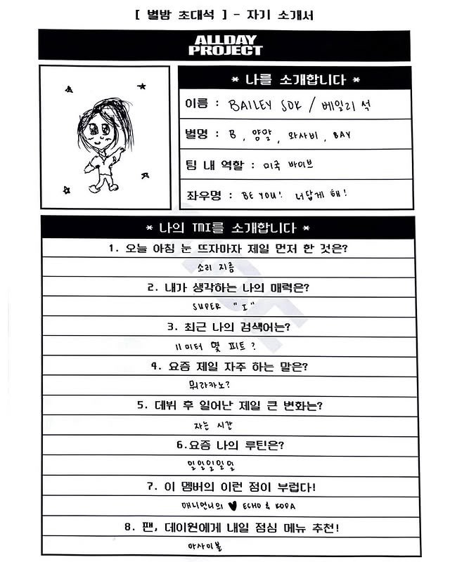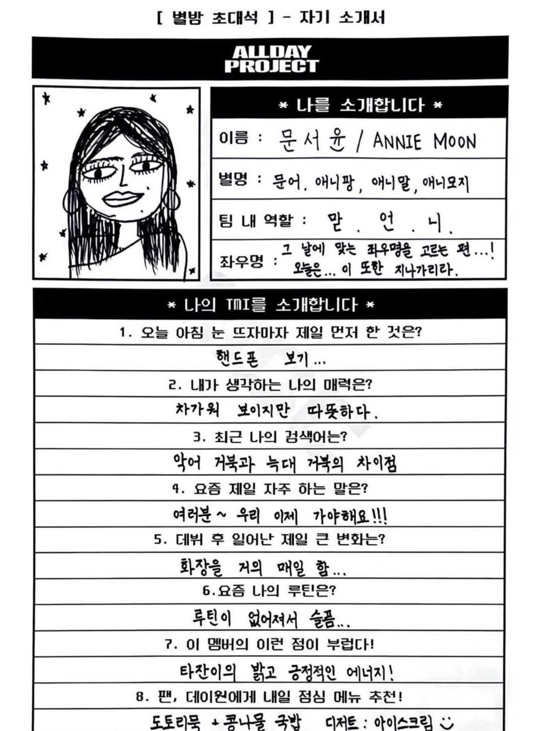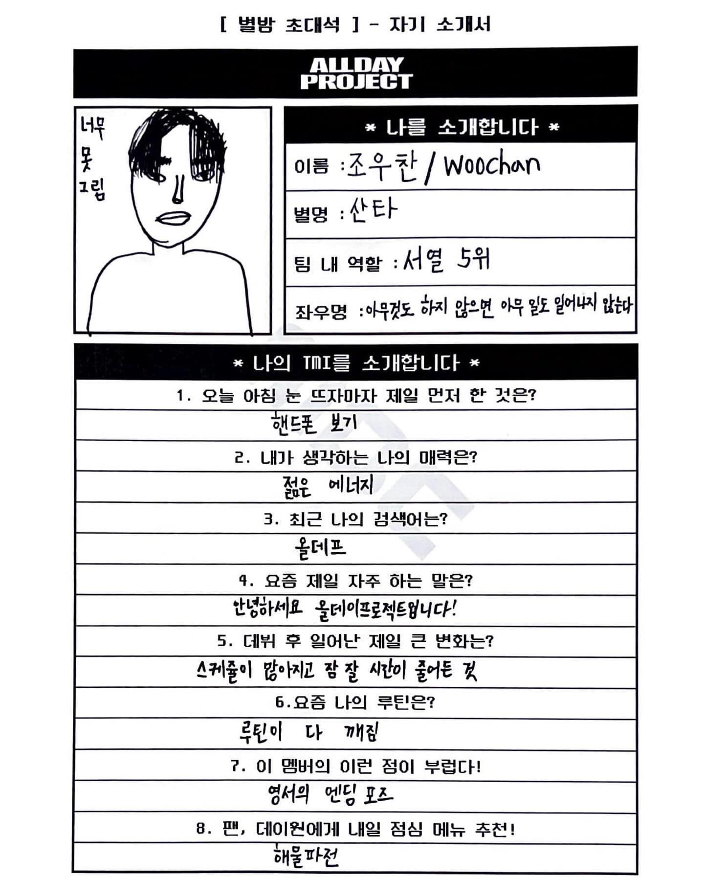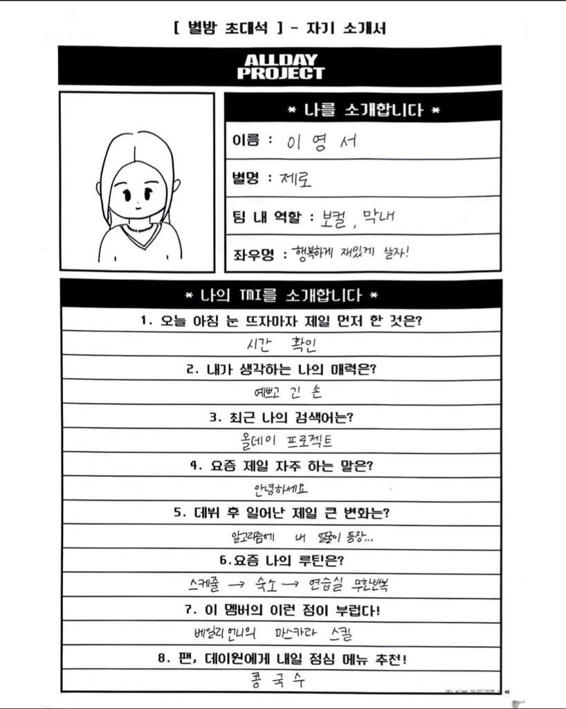 [흥미돋]올데이프로젝트 멤버들이 직접 쓴 자기소개서 작성자수박씨한조각|작성시간25.07.17|조회수109,737 목록 댓글 227 글자크기 작게가 글자크기 크게가 출처: https://theqoo.net/square/3830182015 다음검색 현재 게시글 추가 기능 열기 북마크 공유하기 신고 센터로 신고 댓글 댓글 227 댓글쓰기 답글쓰기 댓글 리스트 작성자오후10시 | 작성시간 25.07.21 오 애니 글씨 맘에든다 작성자하이 캔 | 작성시간 25.07.21 다들 개좋아 ㅜㅜ 작성자저승라라 | 작성시간 25.07.21 11미터 몇피트? 개귀엽다진짜 작성자곱턍베이스 | 작성시간 25.07.21 귀엽다 다듷 작성자LUV춘식 | 작성시간 25.07.24 서열 5위<ㅋㅋㅋㅋㅋㅋㅋㅋㅋㅋ 댓글 전체보기