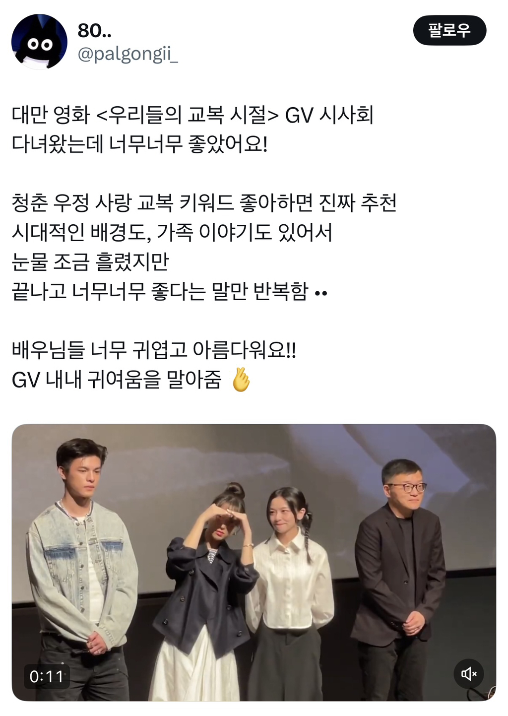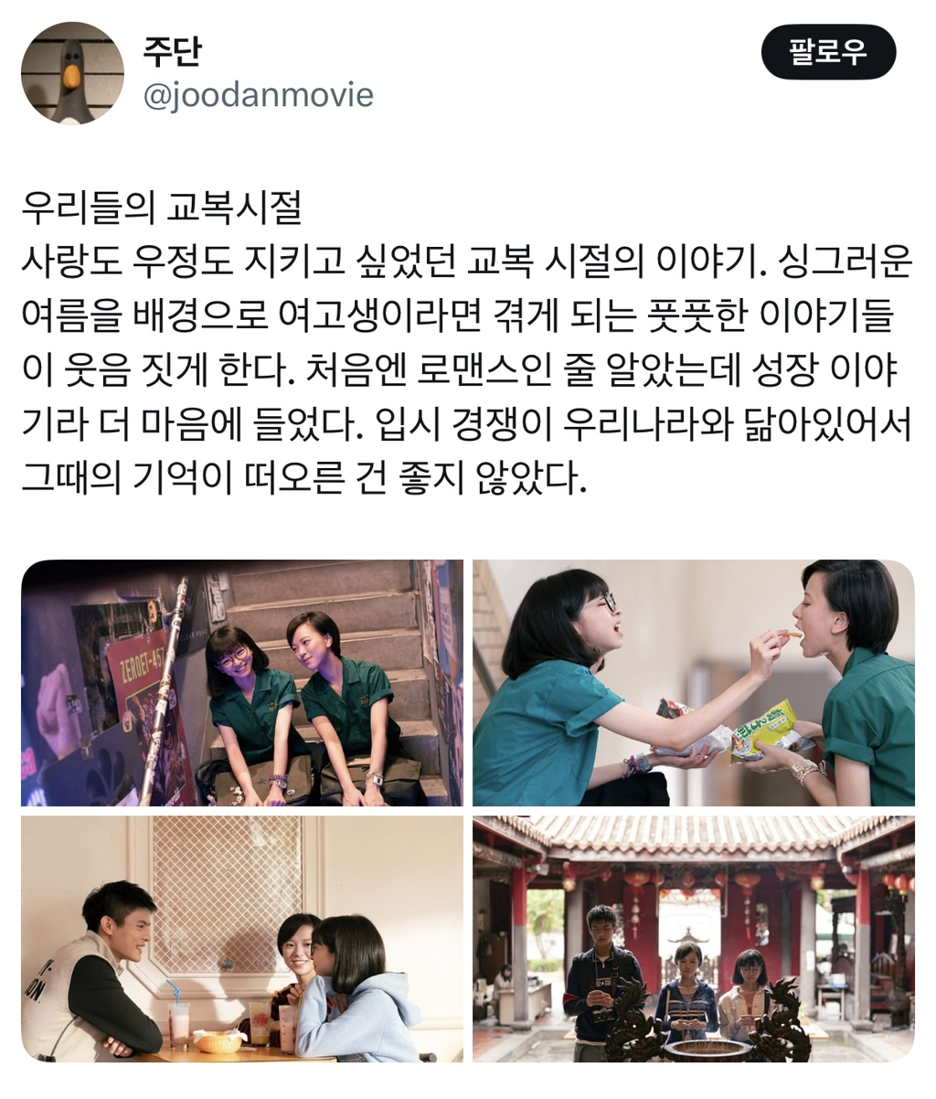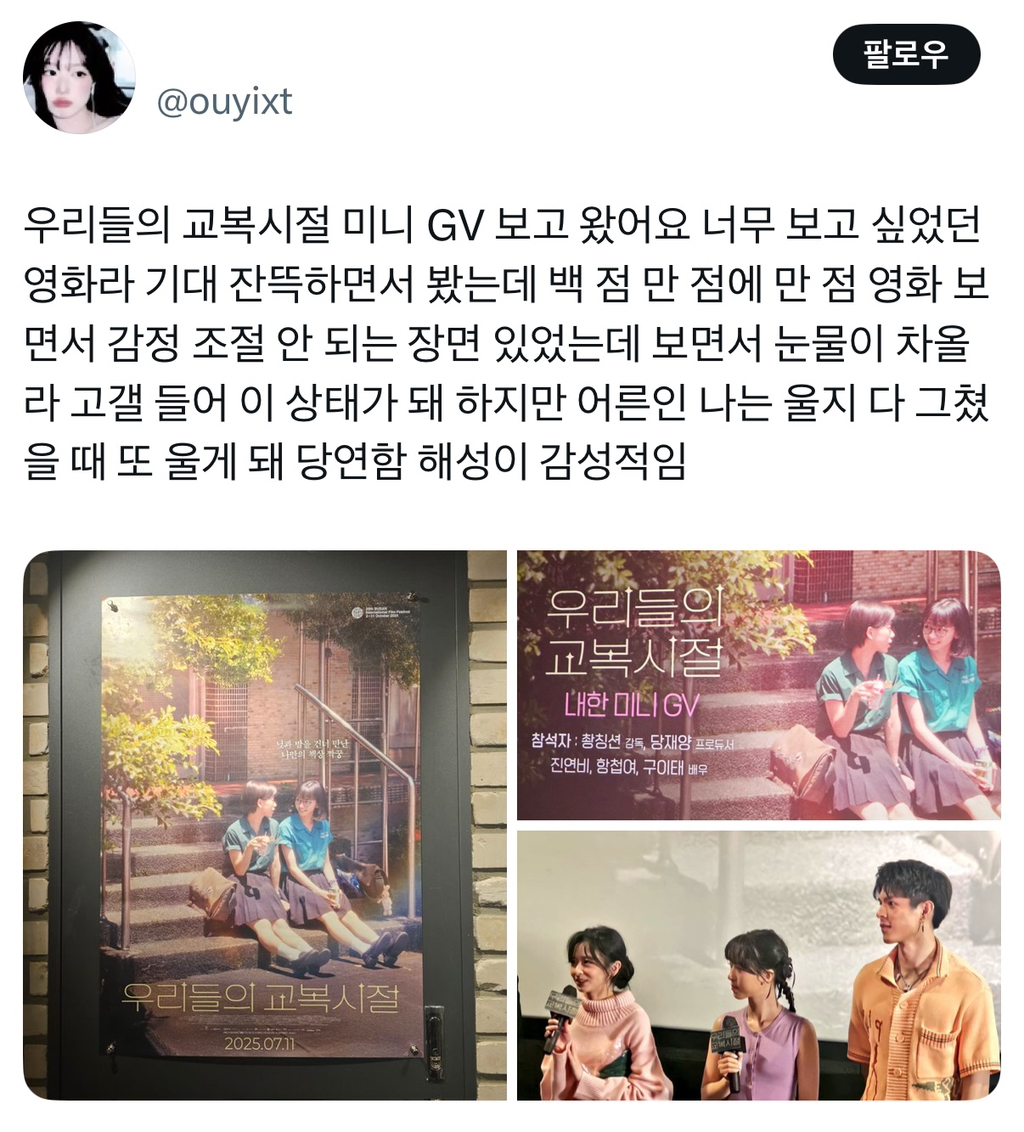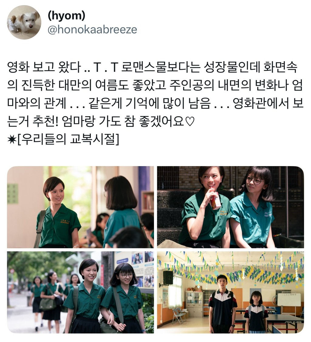 [흥미돋]소녀들한테 반응 좋은 영화 <우리들의교복시절> 후기 모음.twt 작성자퇴근응급|작성시간25.07.18|조회수10,376 목록 댓글 8 글자크기 작게가 글자크기 크게가 출처: 여성시대 (퇴근응급)대만 교복 입고 무대인사 넘 귀엽다 ㅋㅋㅋ 다음검색 현재 게시글 추가 기능 열기 북마크 공유하기 신고 센터로 신고 댓글 댓글 8 댓글쓰기 답글쓰기 댓글 리스트 작성자우남 | 작성시간 25.07.18 재밌겠다 작성자보라빛 정수정 | 작성시간 25.07.18 이거 보고싶은데 근처에 하는 곳이 없어ㅠㅠ 작성자곤드레밥길들이기 | 작성시간 25.07.18 여주 진짜 사랑스러움ㅠ로맨스물로 끝나지않아서 좋았어 작성자히노끼사탕 | 작성시간 25.07.18 이거 부국제에서 봤는데 재밋더라 작성자27373838822724 | 작성시간 25.07.19 나 오늘봤는데 진짜 개애애애애재밌더라 댓글 전체보기
